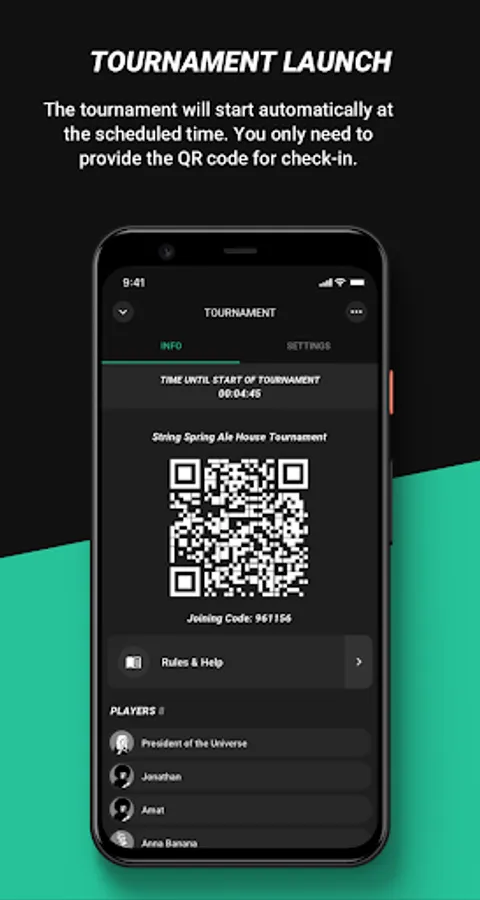 Scheduled tournaments start automatically on the desired date. As the organizer you don't have to do anything else, except to give the QR code to your guests. After that, you can fully concentrate on your activities and let your guests foos.