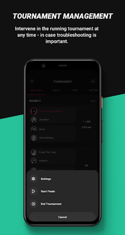 In the best case, the tournament runs all by itself. If something does go wrong, you can use the app to intervene in the tournament: edit results, remove missing players from the tournament, add or remove tables, start the knockout early or end the tournament.