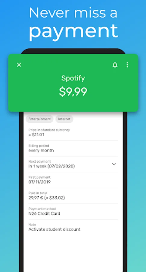 - Add important data for each subscription (description, the start of payment, Payment method, and notes)