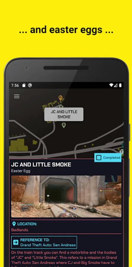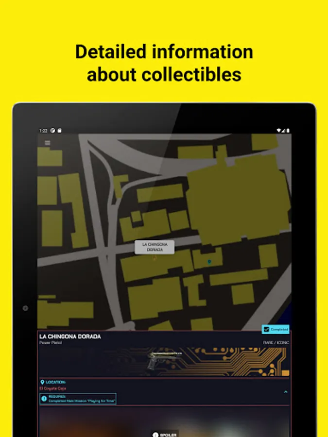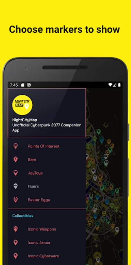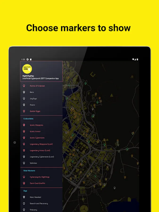 NightCityMap gives you an offline map of Cyberpunk 2077's world with markers for missions and collectibles such as: