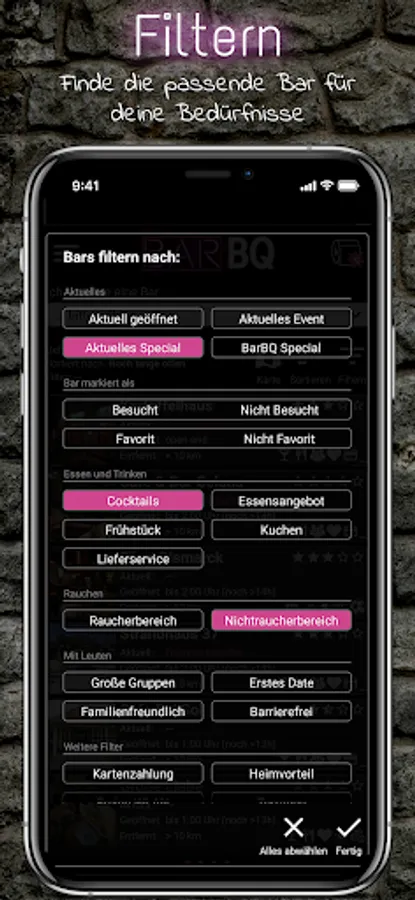 ▪️ Filter by the current happy hour, a bar for a first date or a restaurant with a terrace and find the right place for your needs.