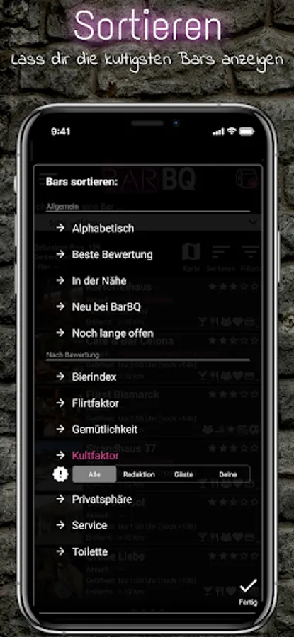 ▪️ Sort by distance, opening times or individual evaluation criteria such as flirt factor or comfort.