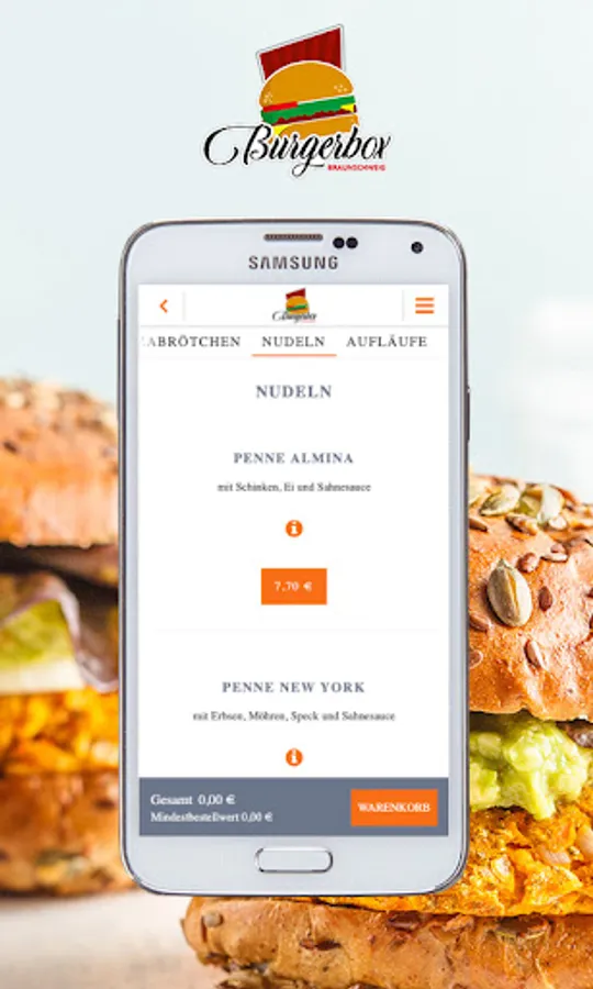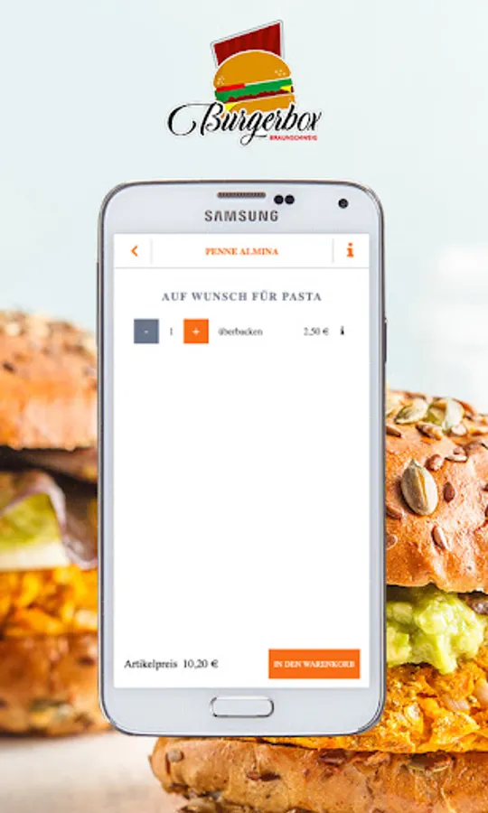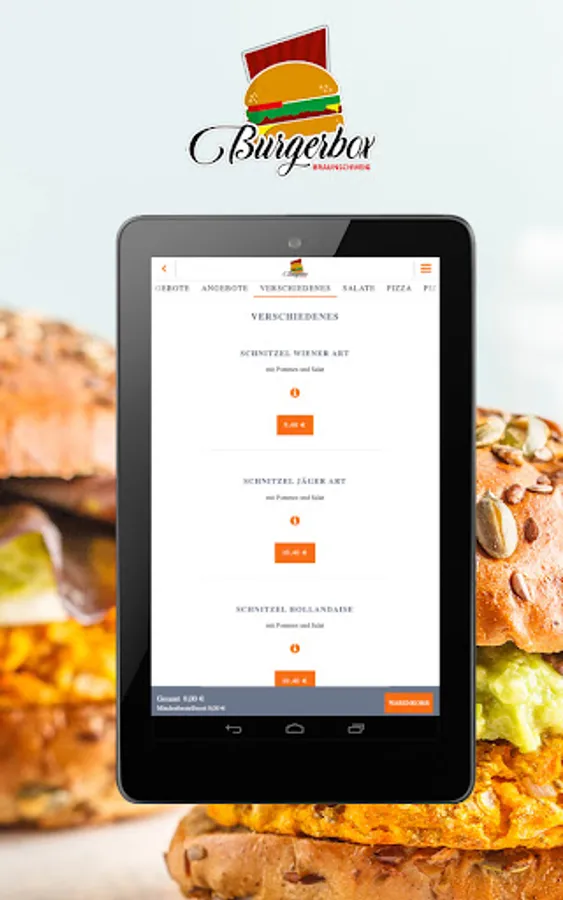 You can find the best burgers in town at Burgerbox. And not only that! Whether crispy finger food, delicious burgers or one of our various salads - there is something for every taste on our menu. It's child's play with your smartphone and our Burgerbox app. Simply enter the address and you can enjoy freshly grilled meat, crispy side dishes, ice-cold drinks and much more. Simply enter your address and off you go! Thanks to your Burgerbox app, the ordering process is extremely easy and delivery is fast. So you can receive your favorite dishes at the door within a very short time and your hunger will be satisfied. Have your order delivered to your home quickly or pick it up yourself at Burgerbox.
