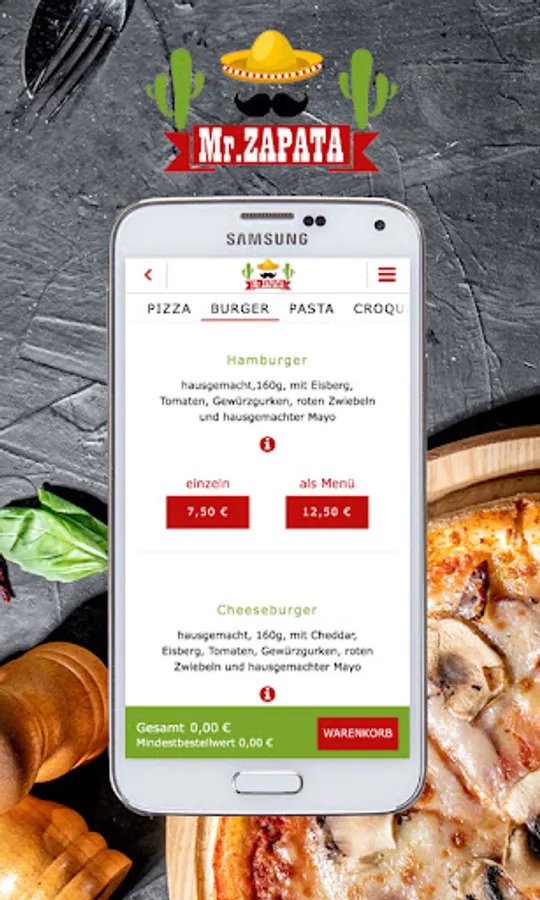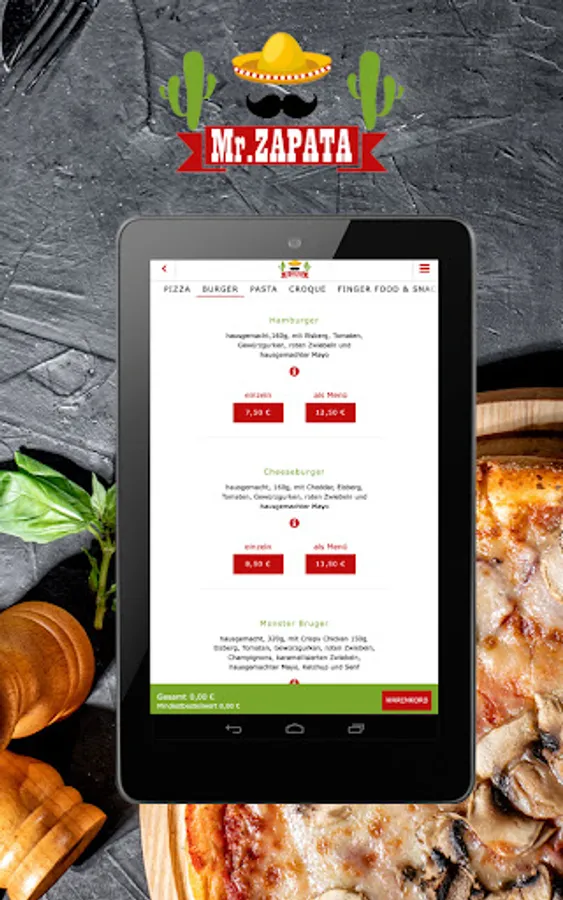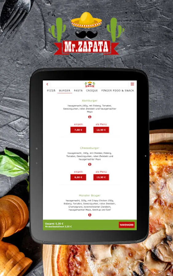 Mr. Zapata brings you the best food in town. Whether it's crispy finger food, fresh burgers or delicious pasta - you'll find what you're looking for here. Ordering food online is easy with your smartphone and our Mr. Zapata app. Simply enter the address and you can enjoy delicious specialties, homemade and only with selected ingredients. Just enter your address and off you go! Thanks to your app, the ordering process is extremely easy and delivery is fast. So you can receive your favorite dishes at the door within a very short time and your hunger will be satisfied quickly. Have your order delivered to your home quickly or pick it up yourself from Mr. Zapata.