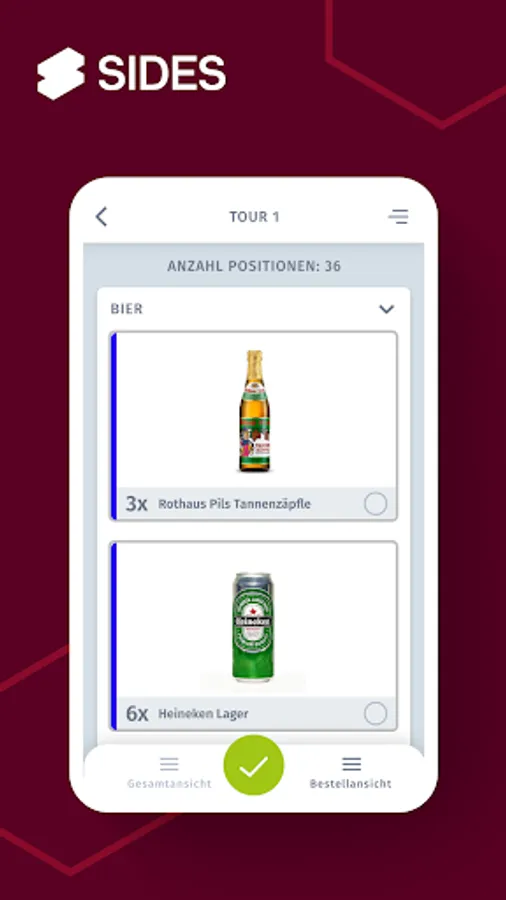 Our SIDES pick app ensures that you can process and document your delivery orders quickly and without errors. At the same time, the app allows you to process orders in such a way that you have an overview of all your driver's tours and can thus optimize tour planning. The tours of your drivers are not only more economical, but you also save a lot of time in scheduling.