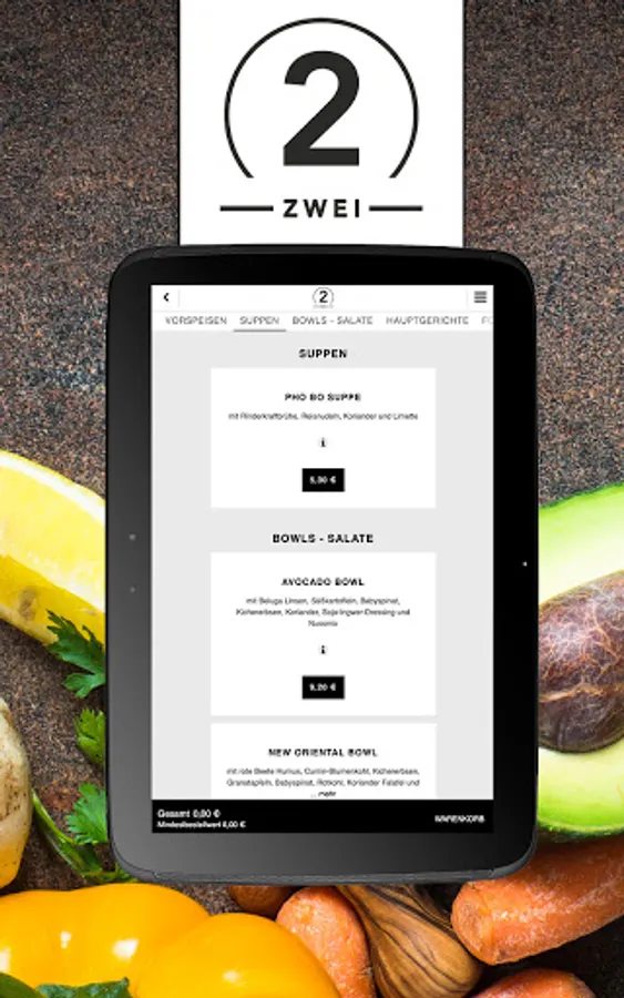 ZWEI is a café, bistro and deli in one. Our cuisine is inspired by the regional and seasonal offerings. Since taste and thus enjoyment are so important to us, we work without finished products and make our ingredients such as sauces, dips, lemonades and dishes ourselves. Sustainability and quality are very important to us. With us you will find exactly the right thing: Whether with meat, vegetarian or completely vegan. It never gets boring on our weekly changing lunch menu and you will discover a new taste experience with every order. Simply download the ZWEI app, enter the address and off you go! The ordering process is very easy and delivery is fast. So you don't have to wait long for your favorite dishes and your hunger will be satisfied quickly. Have your order delivered directly to your home or pick it up yourself at our restaurant in Ludwigshafen.