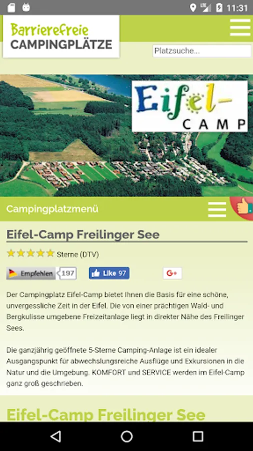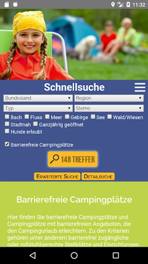 Find accessible campsites accessible offers that facilitate the camping trip. The criteria include barrier-free access or wheelchair accessible parking and facilities at the campsite, short distances, high-contrast signs or waiver of allergenic plants on the camping grounds.
