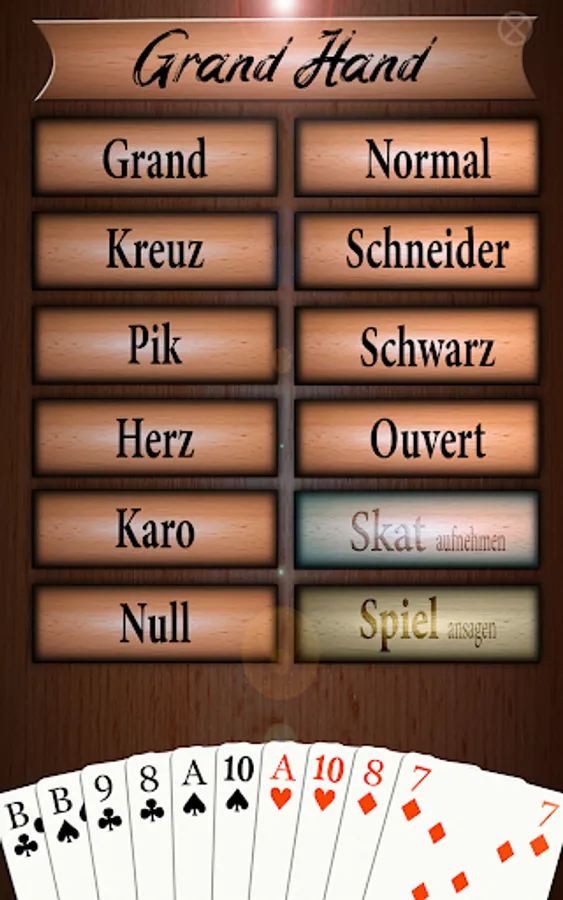 In this Skat app, you do not have to settle for ordinary playing cards. You can play Skat with your own cards instead. Designing your individual playing cards is easy. For instance, if you do not like the original pictures of the queens, kings, and jacks, you can replace them with more attractive ones in your picture library. No limits are set to your imagination!