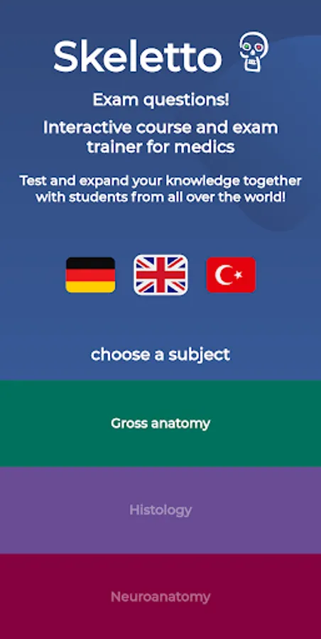 With the help of the Skeletto app, the user can check his knowledge. In this way, gaps are uncovered immediately, knowledge is further consolidated or new knowledge is acquired. For many questions, explanations of the question/answer can be requested. In addition, the user can call up his game statistics.