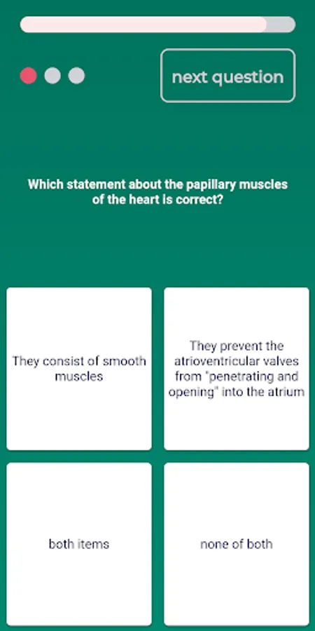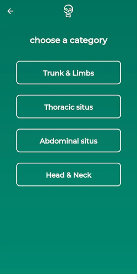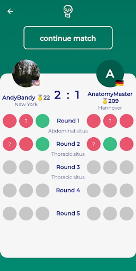 After installation, the user can now test his anatomical knowledge in the categories "Macroscopic Anatomy, Neuroanatomy and Histology" in interaction with other participants from all over the world who are selected by him or determined by the app through a random generator. In each subject, subcategories can be selected, such as in Gross anatomy "Trunk & Limbs", "Thoracic situs", "Abdominal situs" and "Head & Neck". In Neuroanatomy, the subcategories are "Central Nervous System," "Peripheral Nervous System," "Functional Systems," and "Sensory Organs," and in Histology, the subcategories are "Cytology," "Basic histology and tissues", "Organ Histology," and "Sense Organs." All these subcategories contain simple to very challenging questions with additional picture questions.