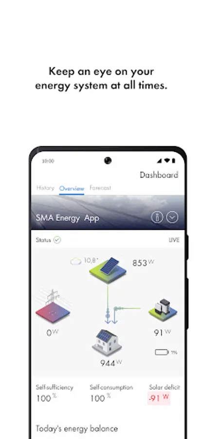 Thanks to the SMA Energy app, you can use your self-generated solar power from your SMA Energy System in a highly sustainable manner and optimize your energy budget. The app is your perfect companion for the energy transition at home and the mobility transition on the road.