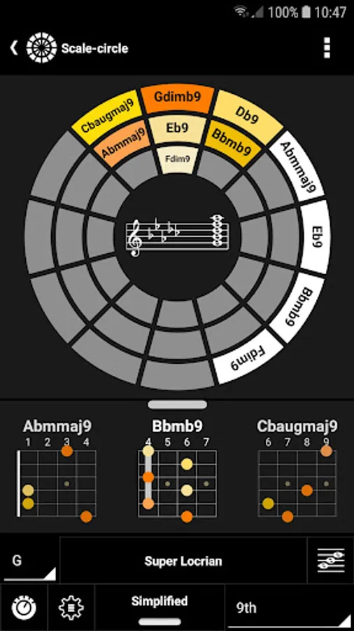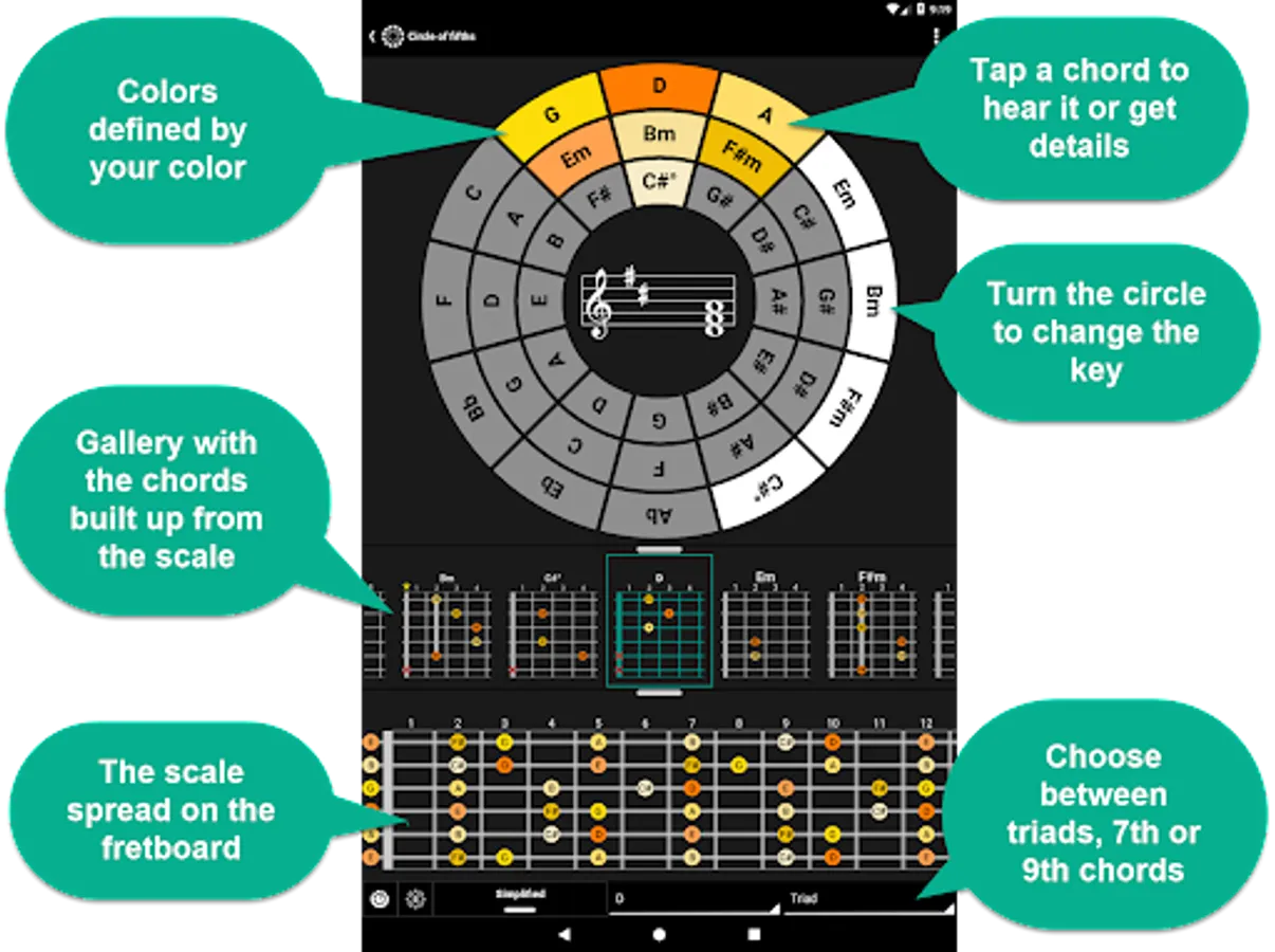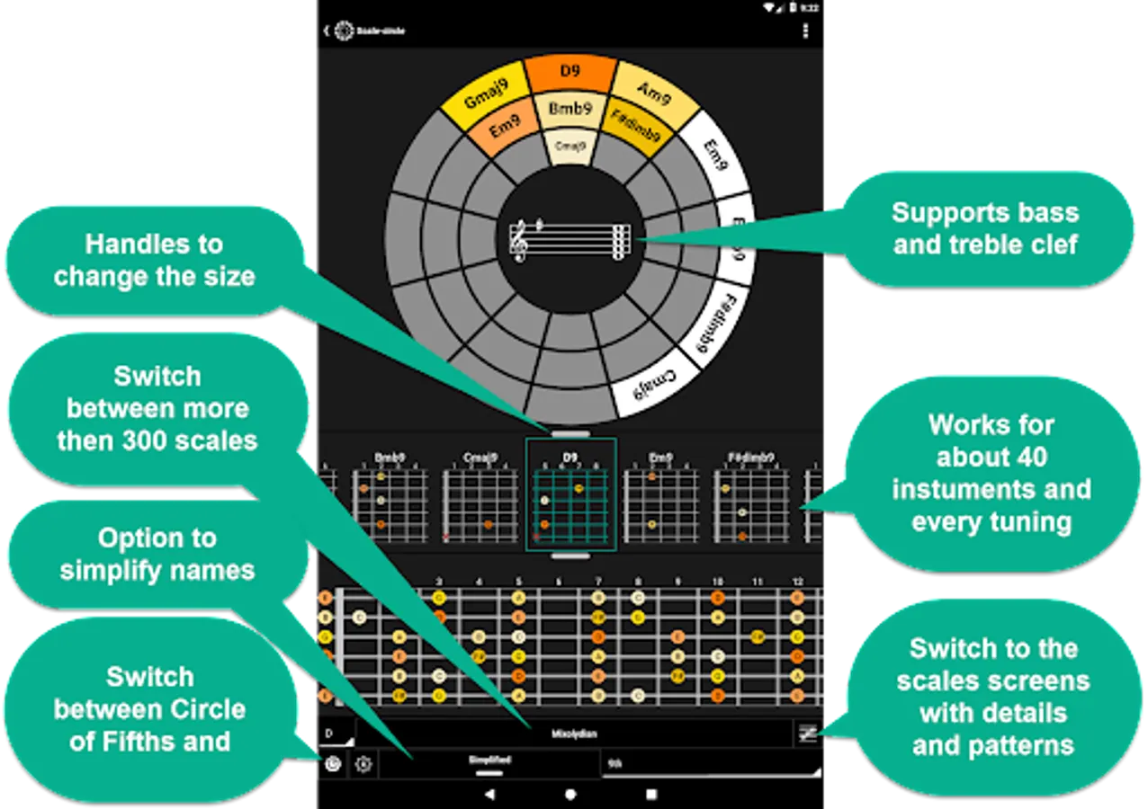 s.mart Circle of Fifths sets standards! It shows every chord, either triads, 7th or 9th. It works for about 40 instruments and any tuning! You can choose between 300 scales beneath the modes of the major scale like Dorian, Lydian or Mixolydian. Go for the best!