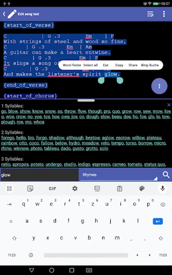 Craft compelling lyrics with ease using our integrated editor and Word Finder. Whether you're in search of rhymes, synonyms, antonyms, or words with specific meanings or patterns, the Word Finder provides tailored suggestions to enhance your songwriting process.