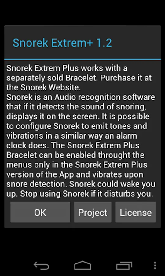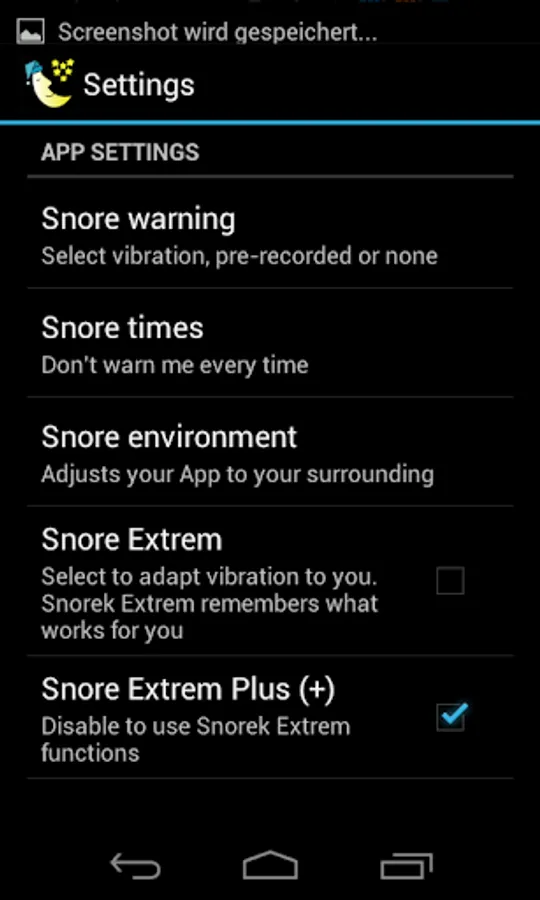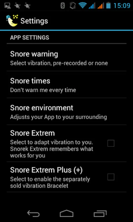 Snorek is a snore detection, monitoring and snore warning App. It interprets audio to identify the sound of snoring. It monitors the time of snoring and it can emit a warning tone. Snorek Extrem Plus works also paired with a Samsung Gear2 Smartwatch.