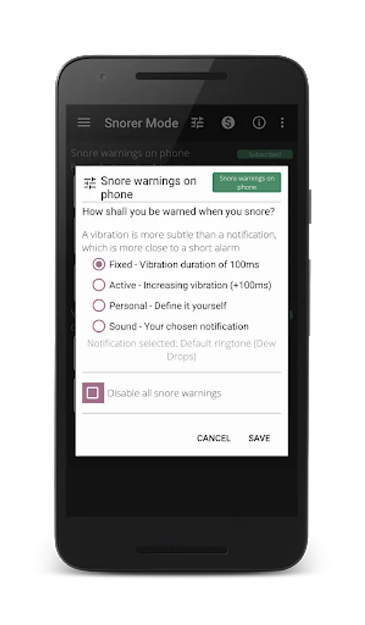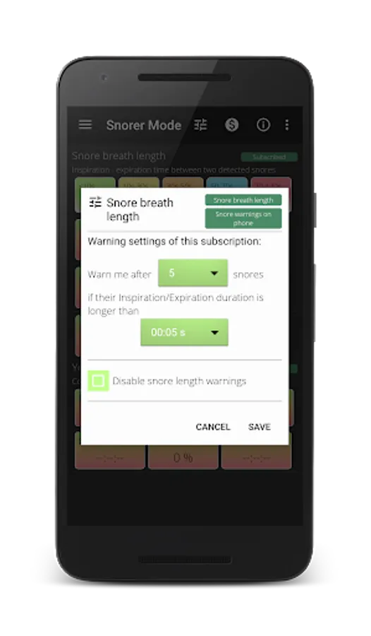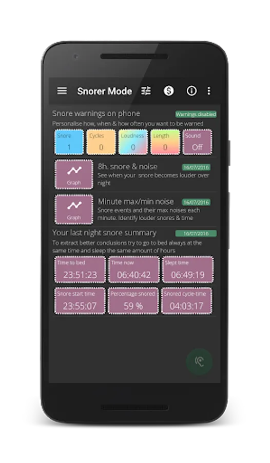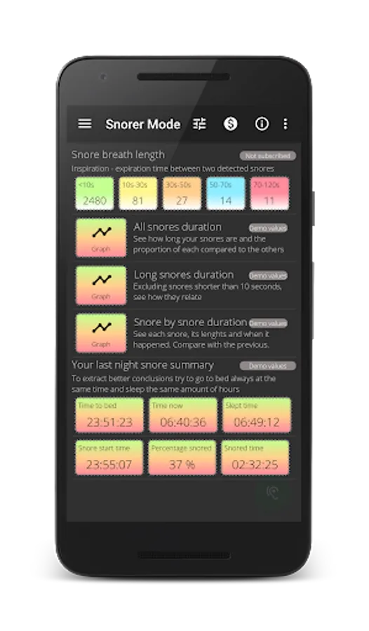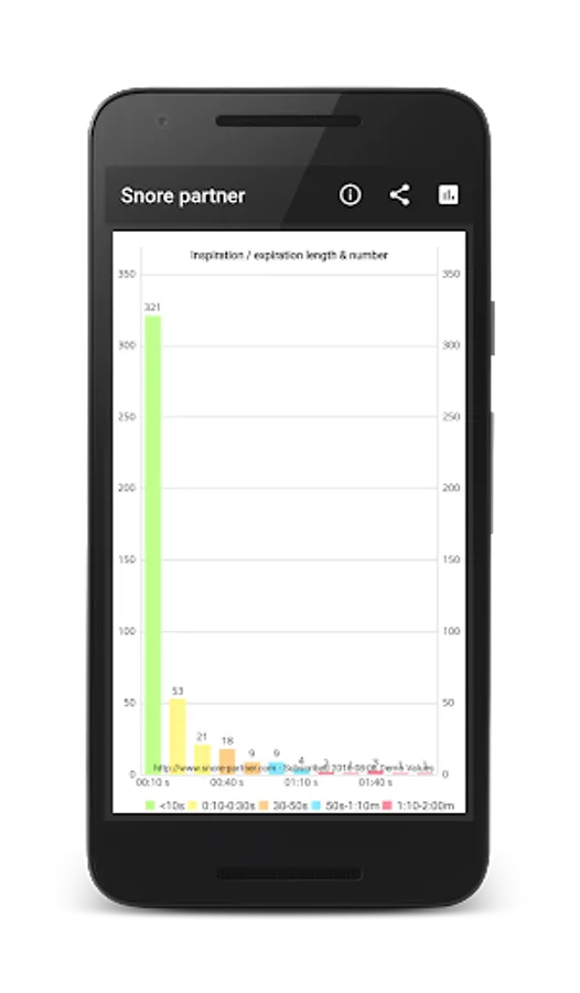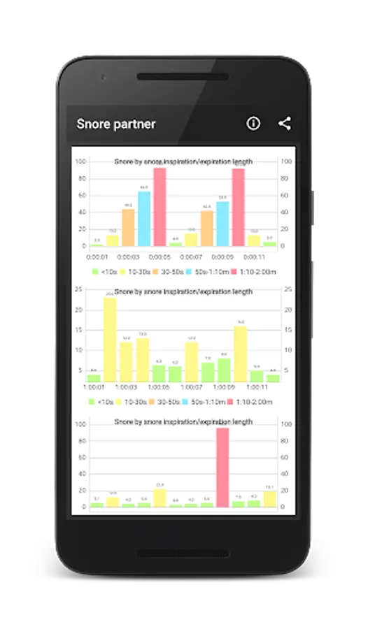 See all your snores separated in bands of 10 seconds. Green colors shows all snores that happen within 10 seconds. Yellow between 10 and 30 seconds. Orange from 30s to 50 seconds. Blue from 50 seconds to 70 seconds and red from 70 seconds to 2 minutes.