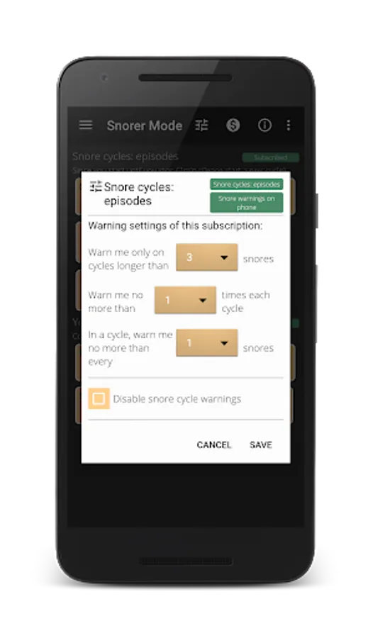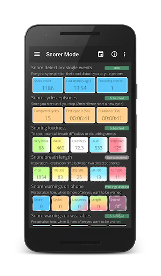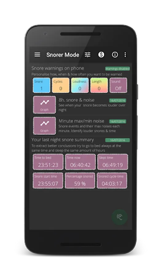 - It allows you to set up personalised warnings, meaning that you can adjust them to make you stop without disturbing you. You do it by using the App one night after the other, seting up warnings and watching on the day after, when they took place and whether you stopped snoring or not.