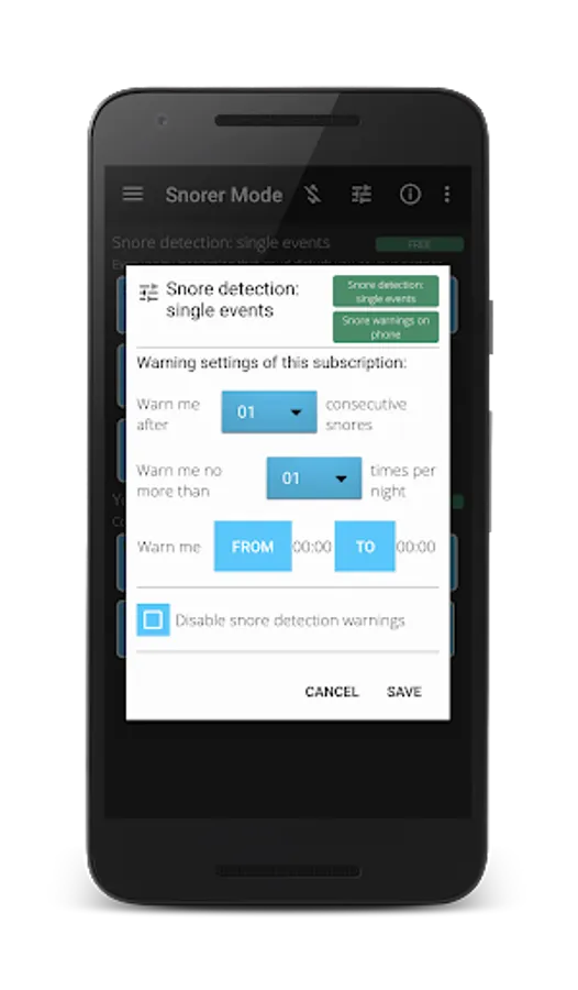 - It allows you to set up personalised warnings, meaning that you can adjust them to make you stop without disturbing you. You do it by using the App one night after the other, seting up warnings and watching on the day after, when they took place and whether you stopped snoring or not.