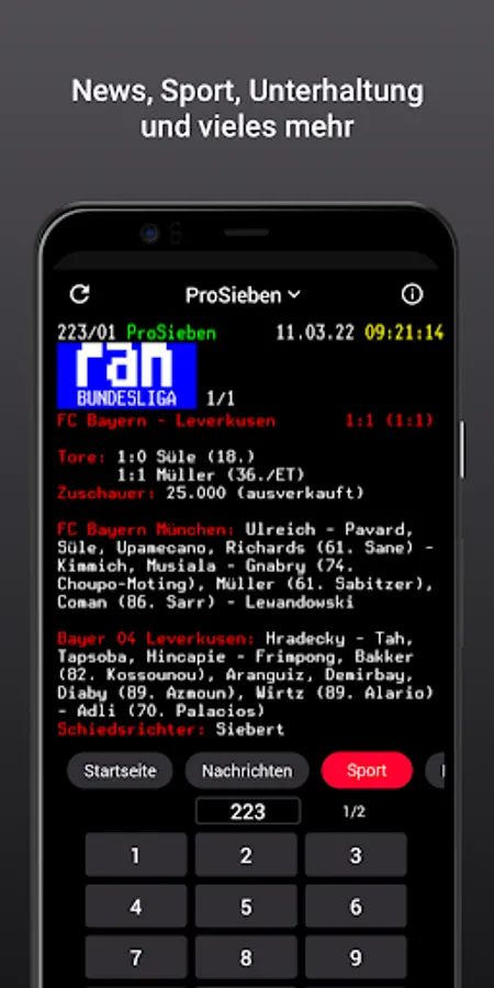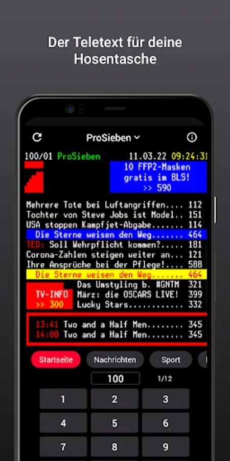 With the Teletext 71 mobile application, this information from the seven.one stations can now be called up and used free of charge from anywhere on the go using a smartphone or tablet. The application shows ad hoc information and news on various topics on over 2500 pages, such as