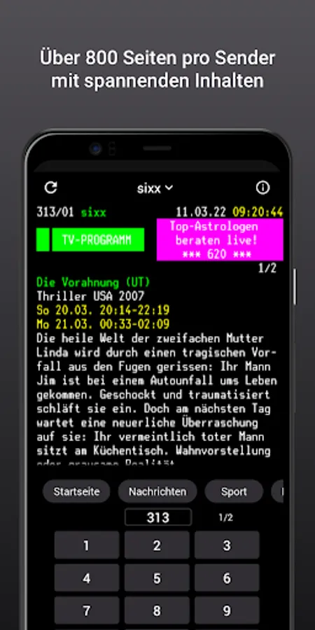 The navigation or retrieval of the various teletext offerings from the Seven.One broadcasting group is done via the display or by directly entering the three-digit page number. Simply "swipe" left or right for scrolling pages.