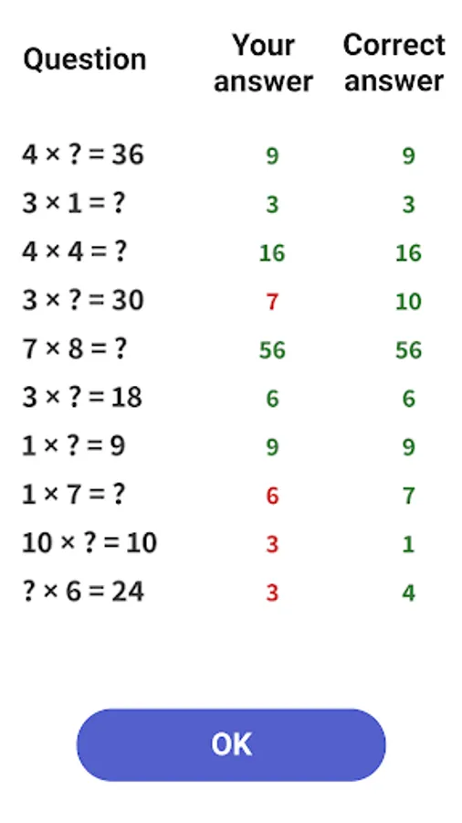After each training, you have the opportunity to see which questions have been answered correctly and which have not. This will help next time to improve the result and remember your times tables at home in an easy, step-by-step way.