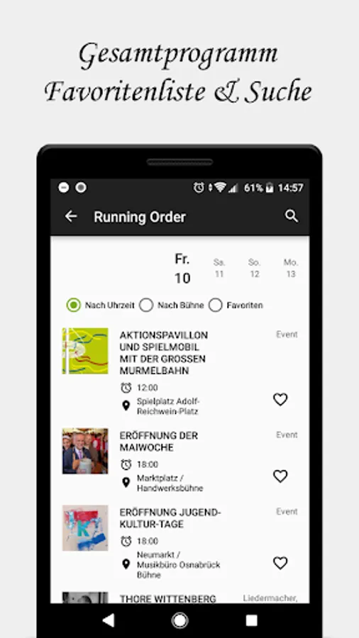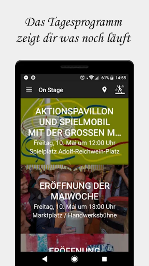 - day program. The app shows you which events take place at the current Maiwochentag.