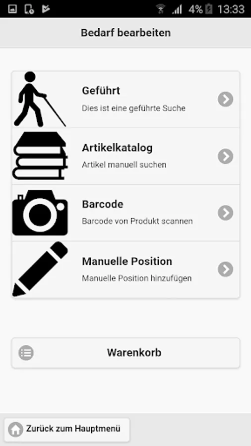 The article selection can be determined by means of a barcode scan, manual input or a predefined structure. The article structures shown in the required app are read directly from kwp-bnWin and displayed in the app.