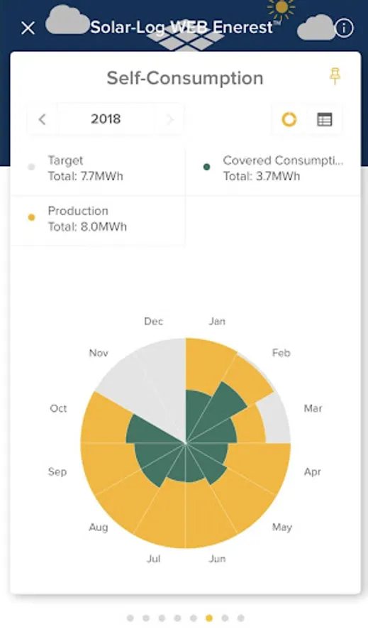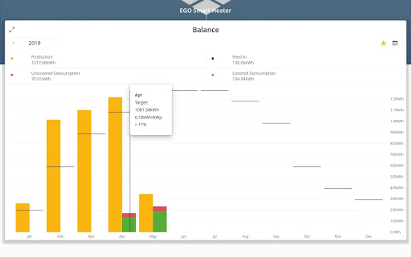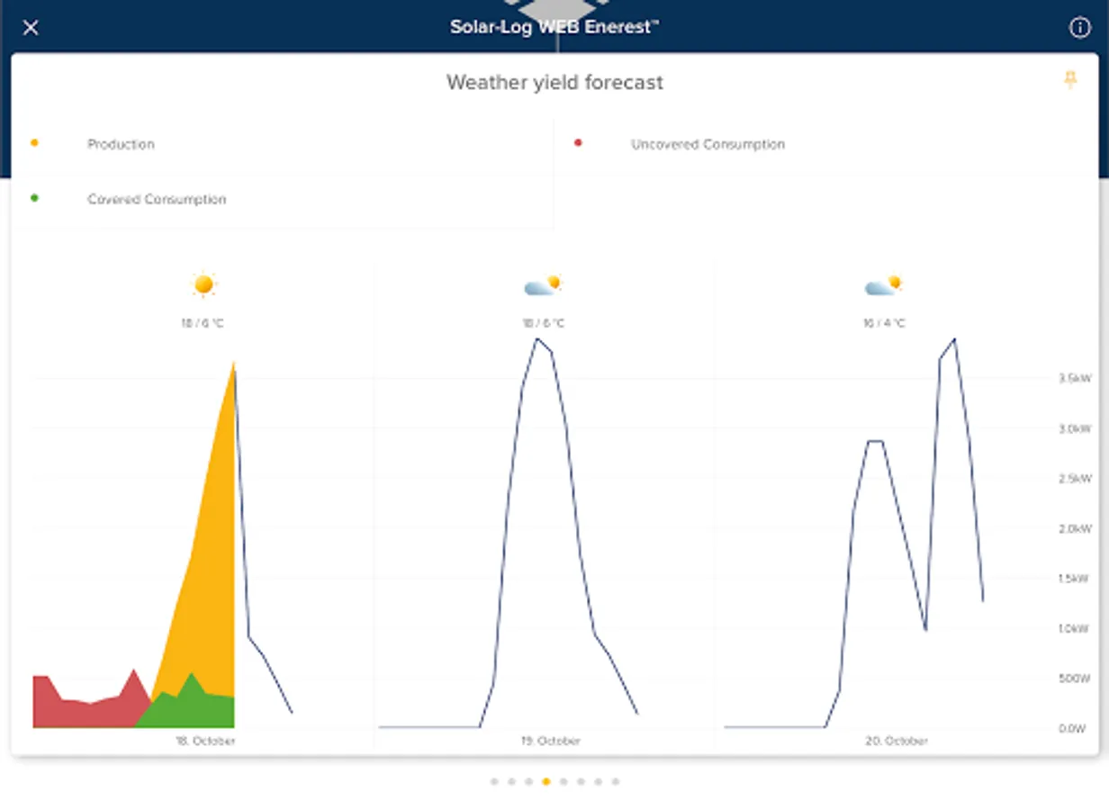 The App concisely presents the production, feed-in, self-consumption and uncovered kWh. These values are also available as a table listing. Current and historical plant data as well as connected components (for example heaters or heat pumps) can be visualized.