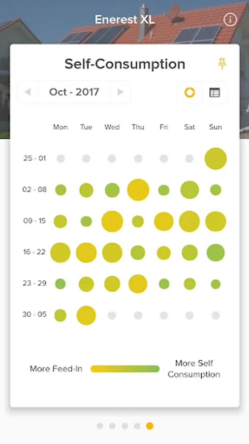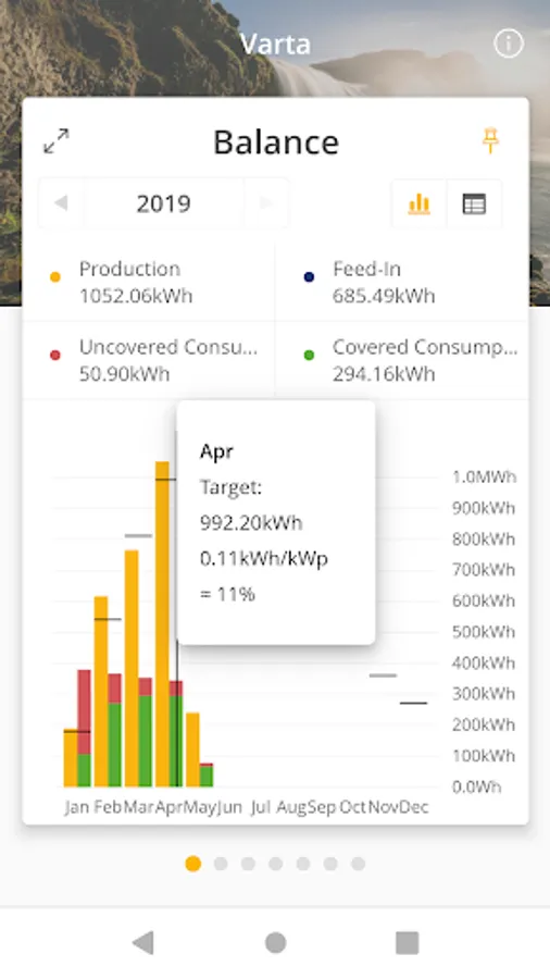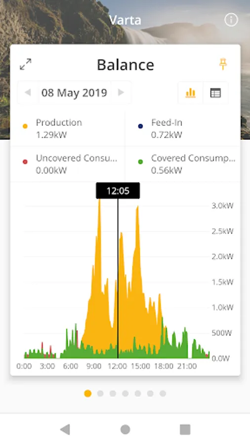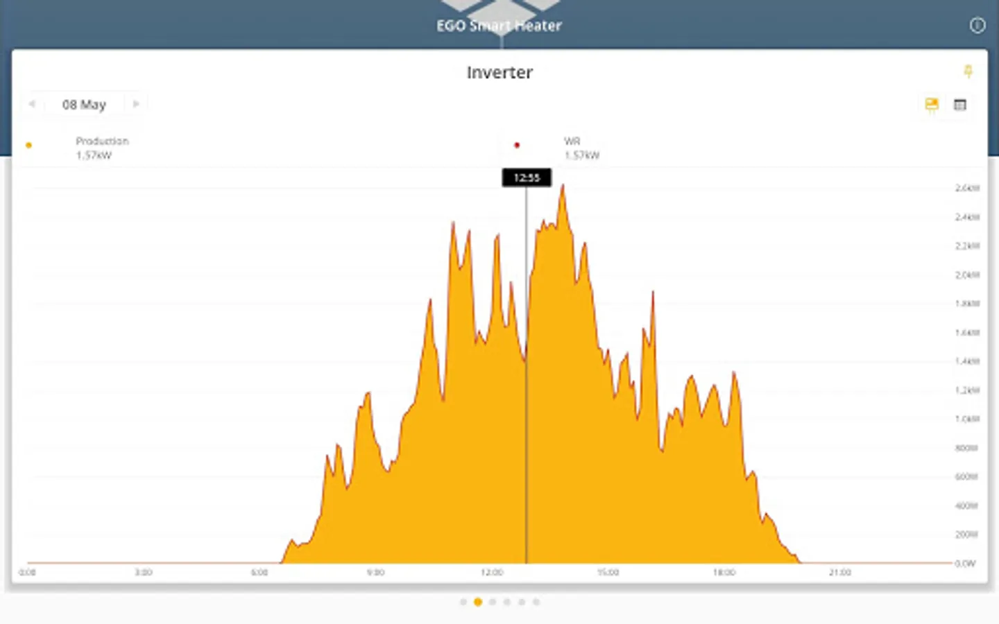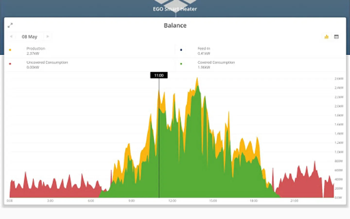 The App concisely presents the production, feed-in, self-consumption and uncovered kWh. These values are also available as a table listing. Current and historical plant data as well as connected components (for example heaters or heat pumps) can be visualized.