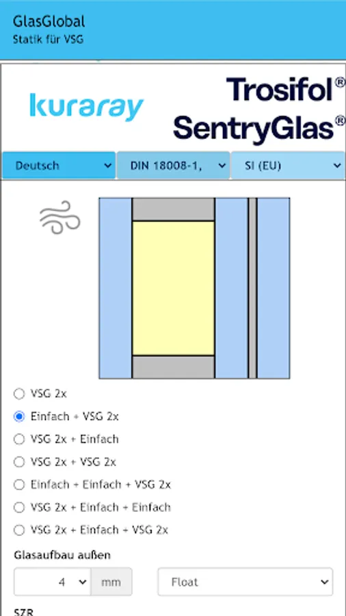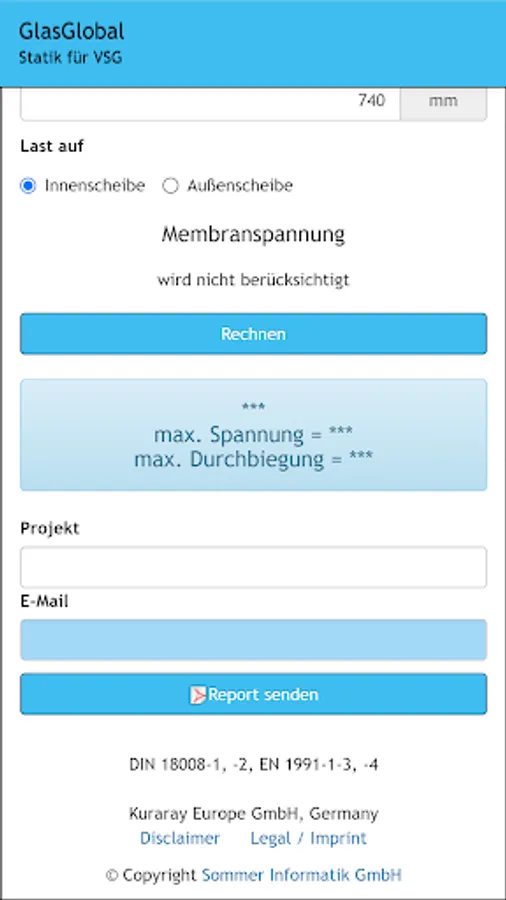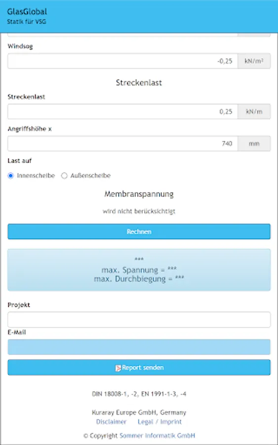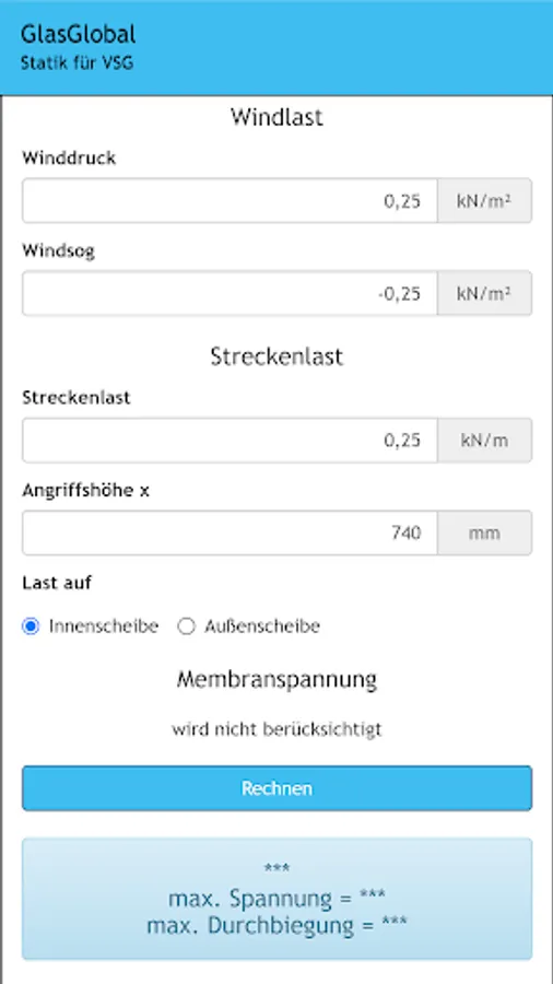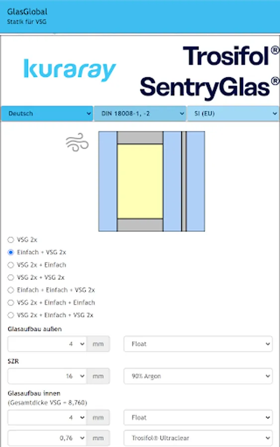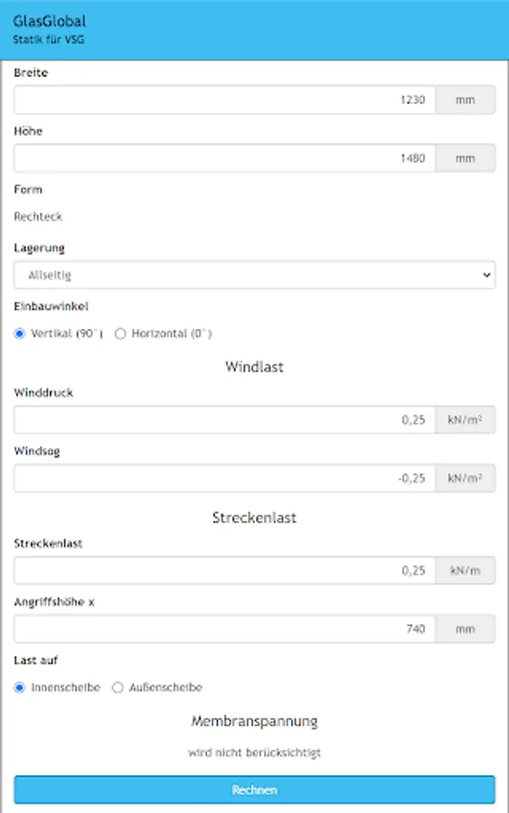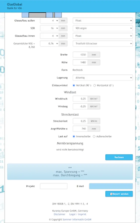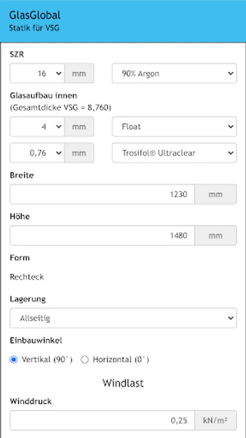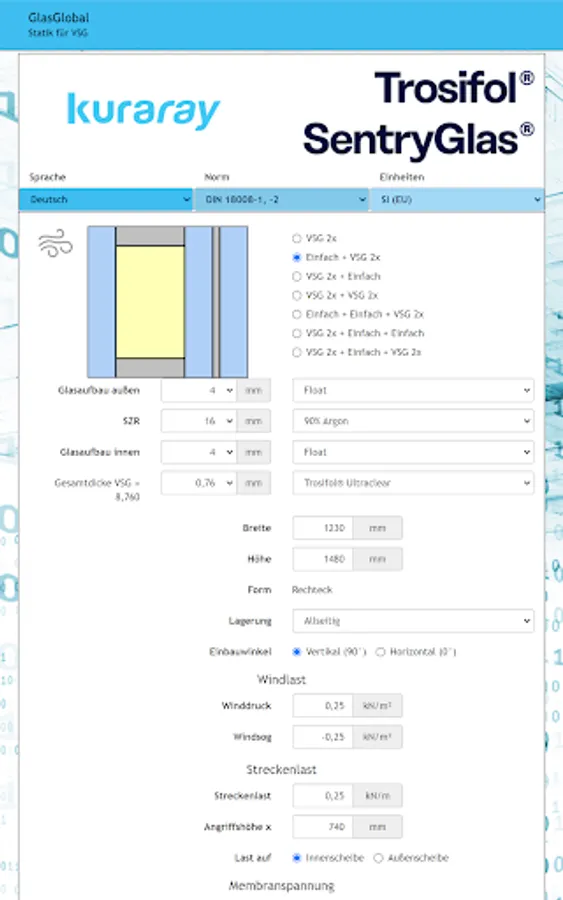 Global glass is the expert software for calculating the static detection of glass (single or VSG) in combination with PVB films.