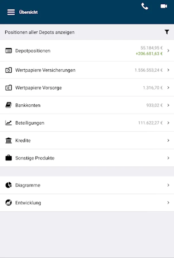 - Consolidated overview of assets including all fund shares, insurances, participations and bank accounts