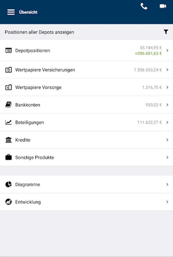 - Consolidated overview of assets including all fund shares, insurances, participations and bank accounts