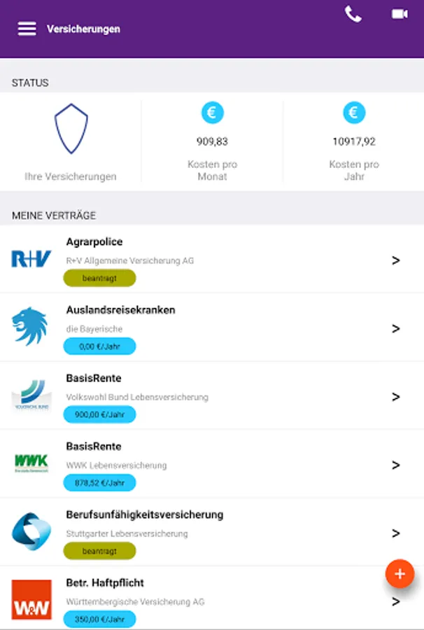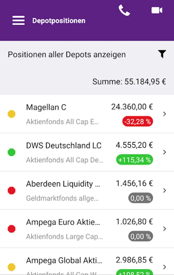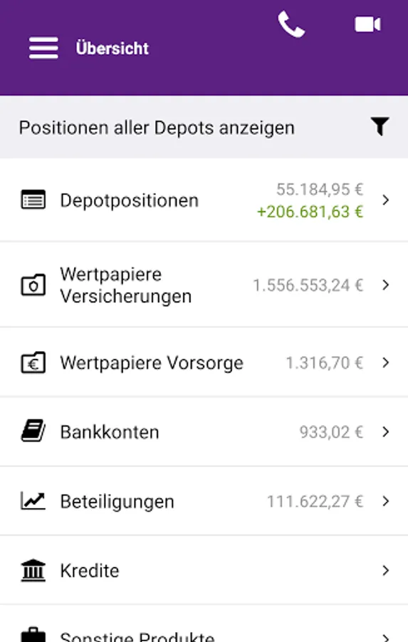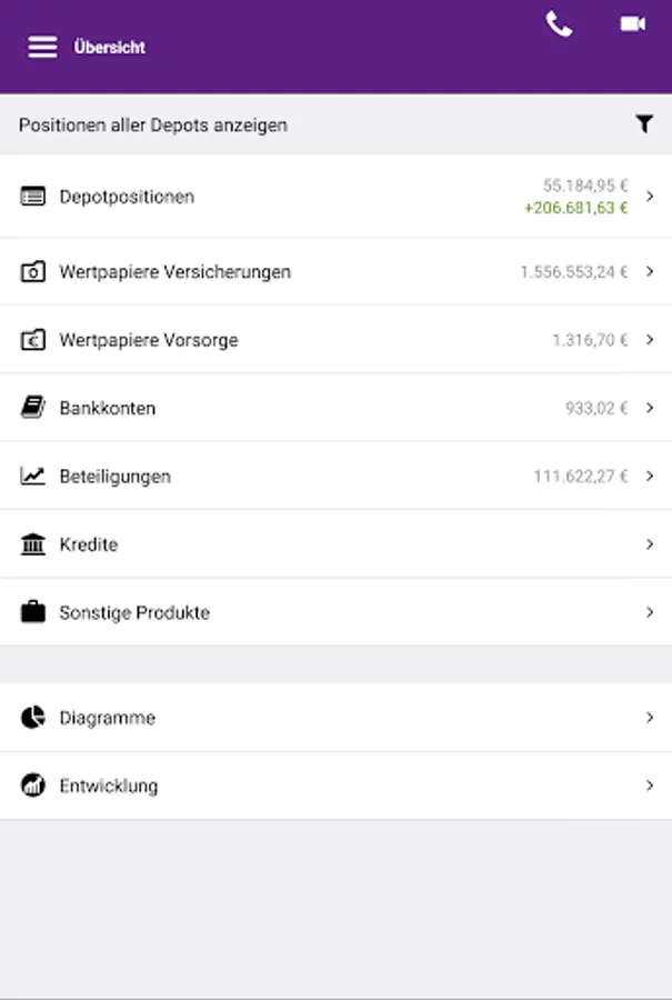 - Consolidated overview of assets including all fund shares, insurances, participations and bank accounts