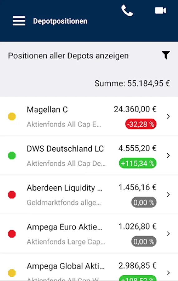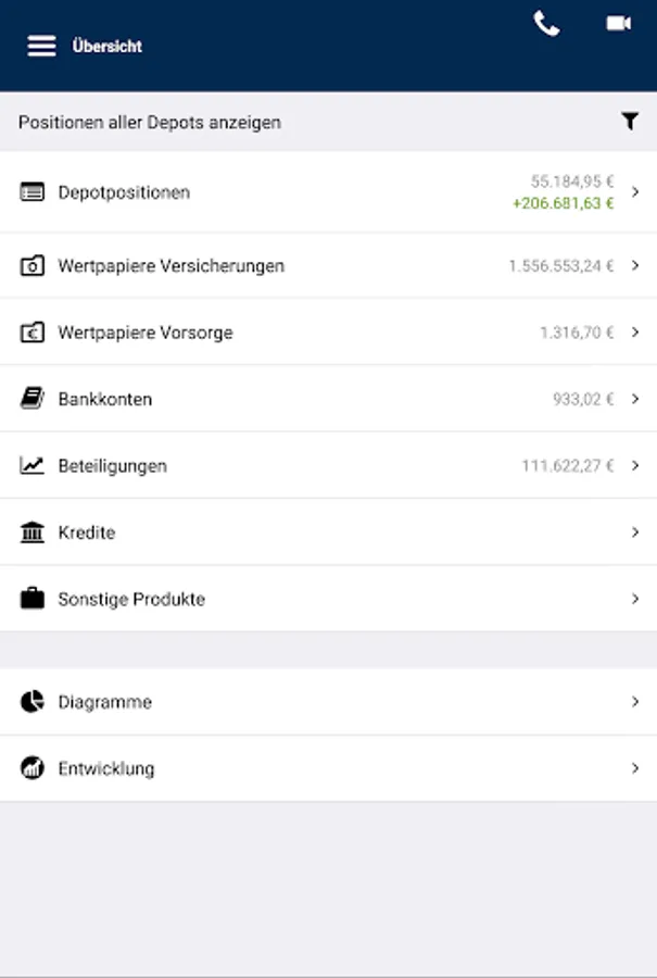 - Consolidated overview of assets including all fund shares, insurances, participations and bank accounts