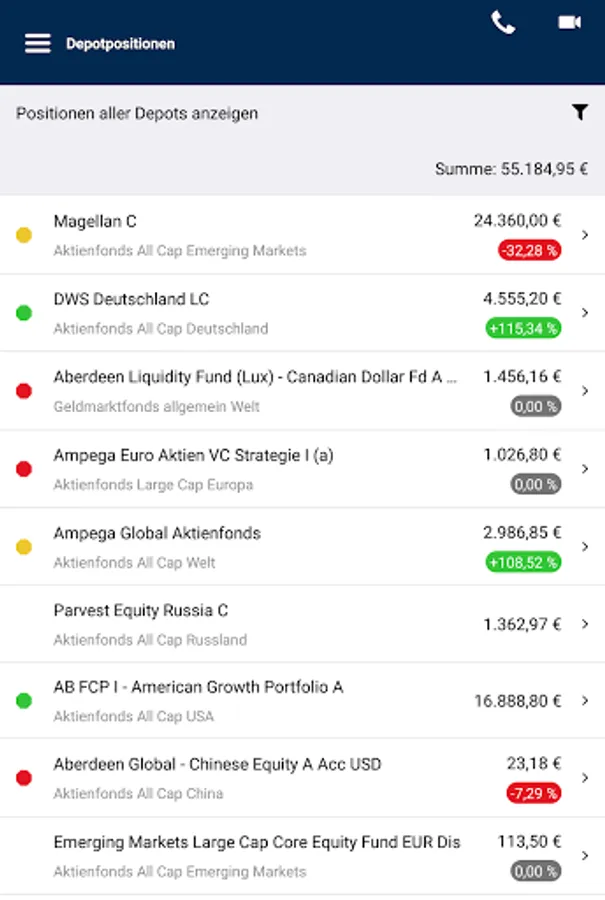 - Factsheets on the individual funds including performance, risk return, key figures, profit & loss, asset allocation