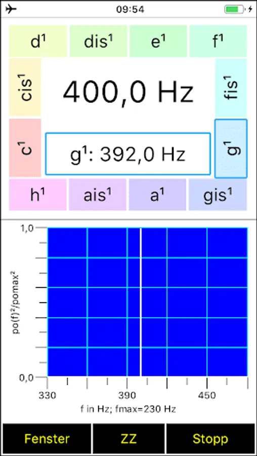 The basic frequency of a sound determined by the app with great accuracy (deviation: max. 0.2 Hz) is helpful for analyzing musical instruments or voices of musical instruments. In addition to the base frequency, the musical note and the frequency of the note that is close to the base frequency are displayed. This enables musical instruments (especially guitars) to be tuned easily and precisely.