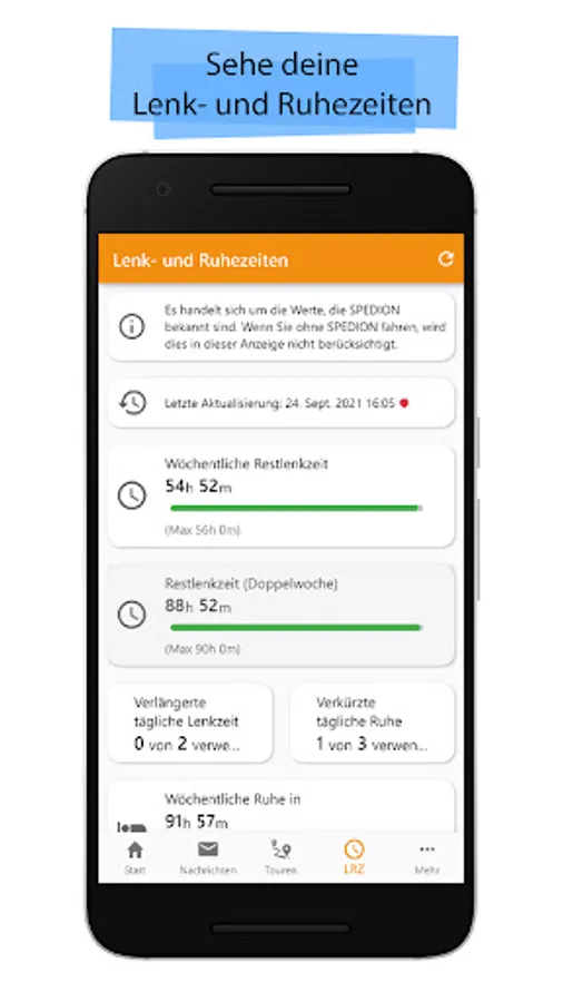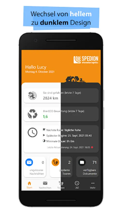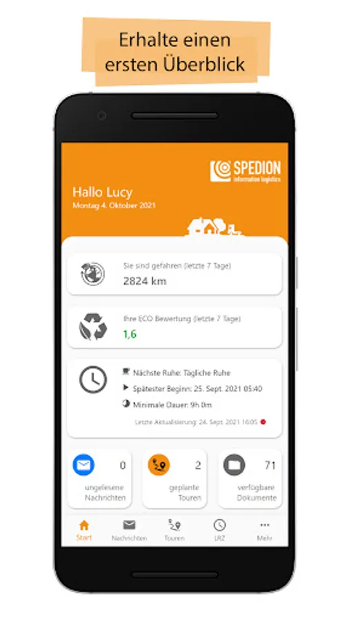 Use the LUCY app to call up information for the next working day. You will receive an overview of the driving and rest times transmitted to SPEDION, tours planned for you and you can view documents that have been approved for you. You can exchange messages with your company in advance.