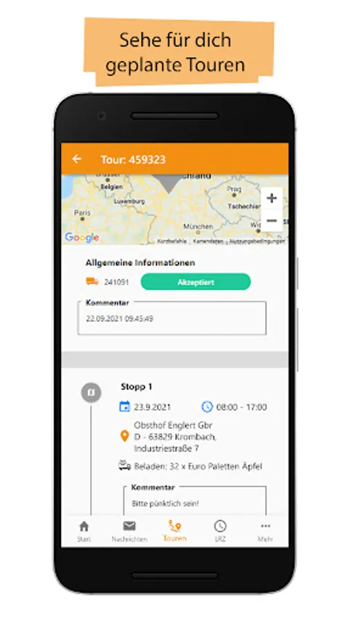 Get more detailed information about tours planned for you. Look at the route of the tour on the map and get an initial overview of the stop and load details.