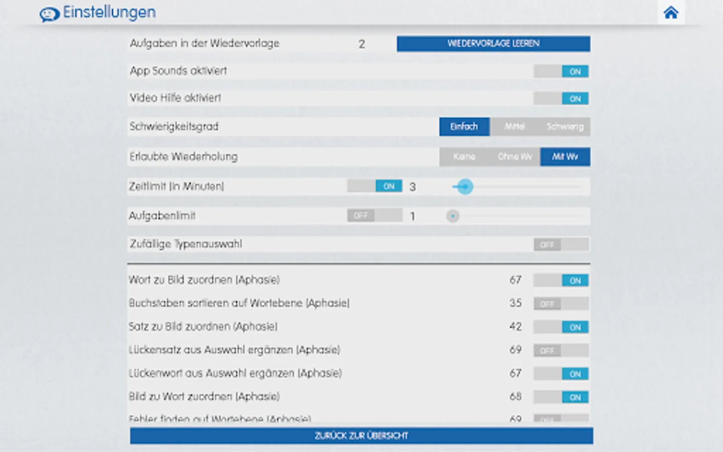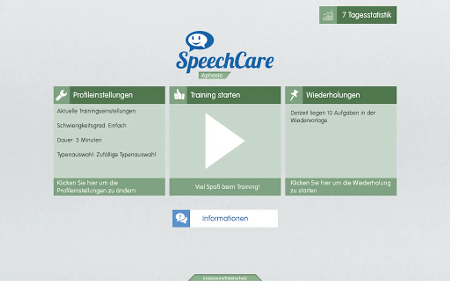 Aphasia patients often require an extensive and differentiated exercise program should be individualized to each patient in order to improve the language and communication skills. The Speech Care App includes a variety of exercises that different areas of language, speech, reading and writing exercise. They can be individually compiled and adapted to the progress in the course of development. It is possible to set different levels of difficulty and change again. The integrated video sequences facilitate the patient's word activation in a completely new way. The operation is very simple and accessible and so practicing and exercising when and wherever you want easily possible!