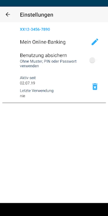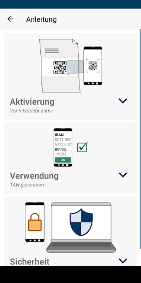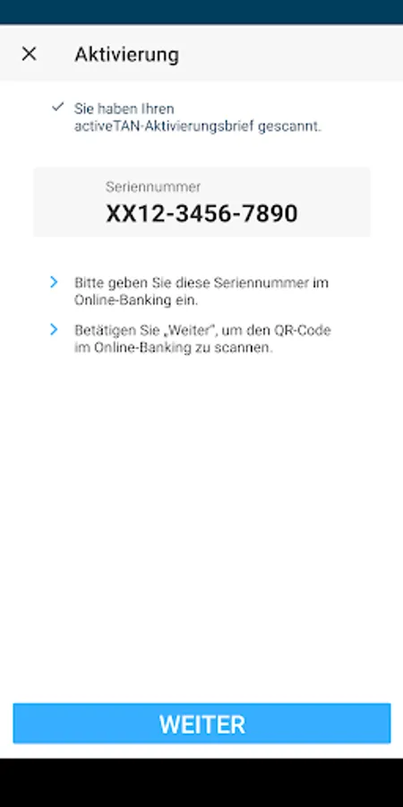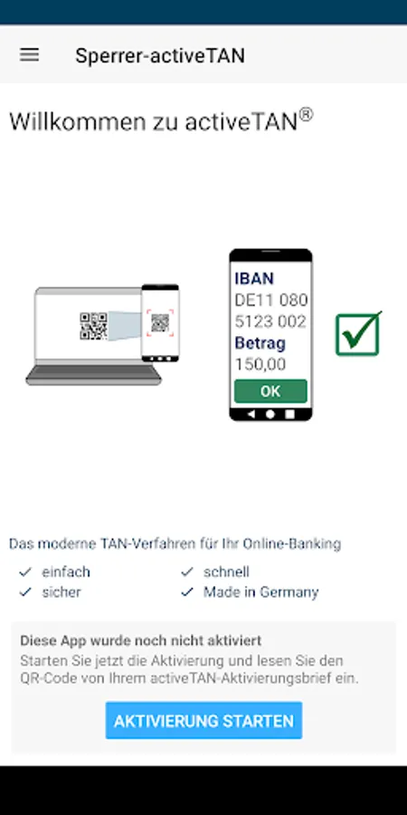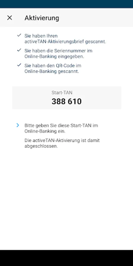 To activate the activeTAN procedure for your personal online banking access you need an activation letter in addition to this app. You can request the activeTAN activation letter at any time in online banking under the menu item "activeTAN administration".