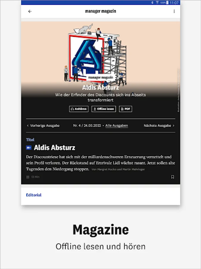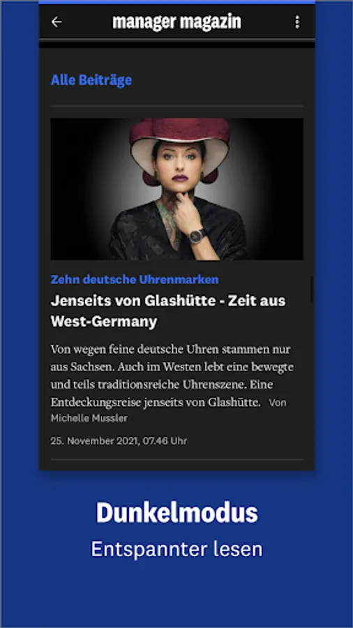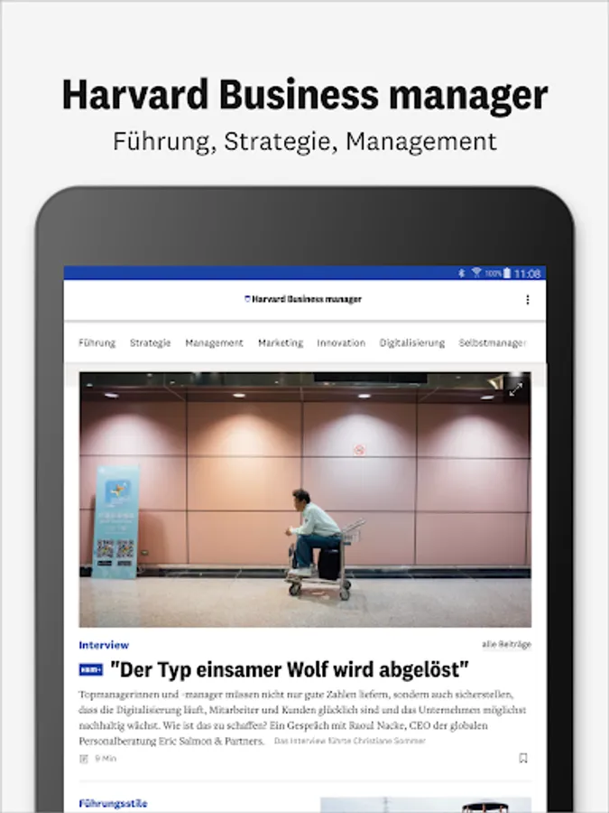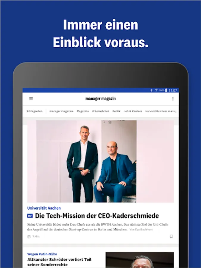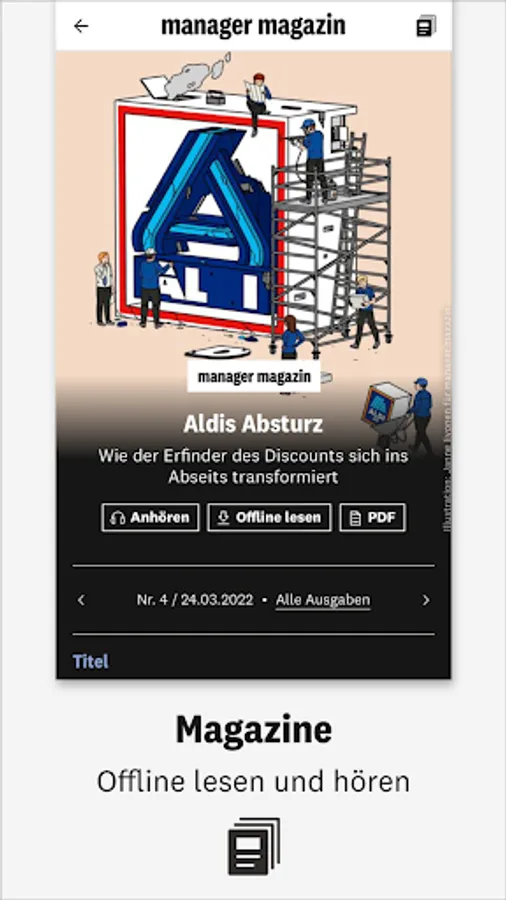 • A compact overview: Discover business journalism in all its diversity, presented in a clear and high-quality manner. Get on board and get direct access via the navigation bar - to the daily updated content of manager magazin and Harvard Business manager as well as our digital magazines. You can download the individual issues and read them conveniently offline.