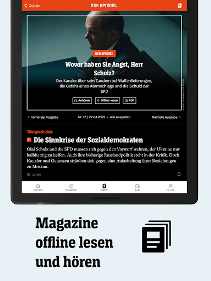 •A central navigation: The navigation allows you direct access to our headlines from politics and the world, to the audio offering - and now also to the weekly digital edition and all other SPIEGEL digital magazines in one compact Overview.