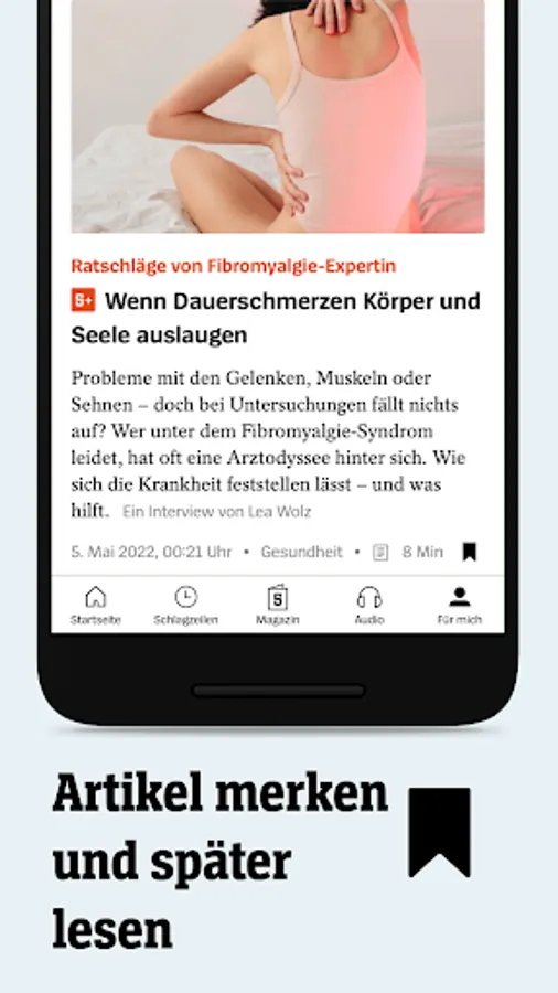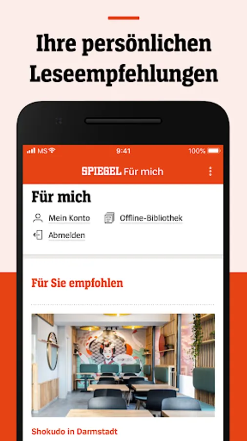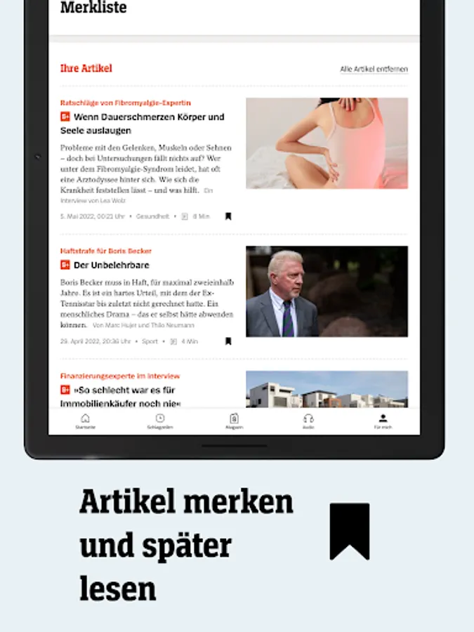 •»For me«: Your push settings, personalized reading recommendations and news and headlines from business, politics, sports and culture from Germany and around the world, the most frequently commented articles and your personal reading list.