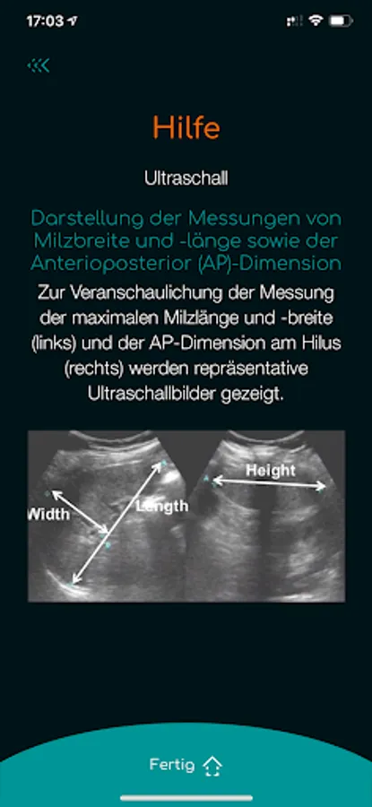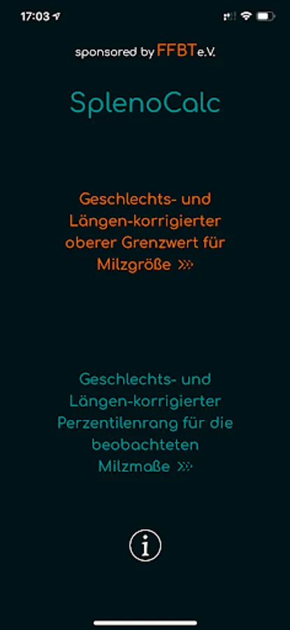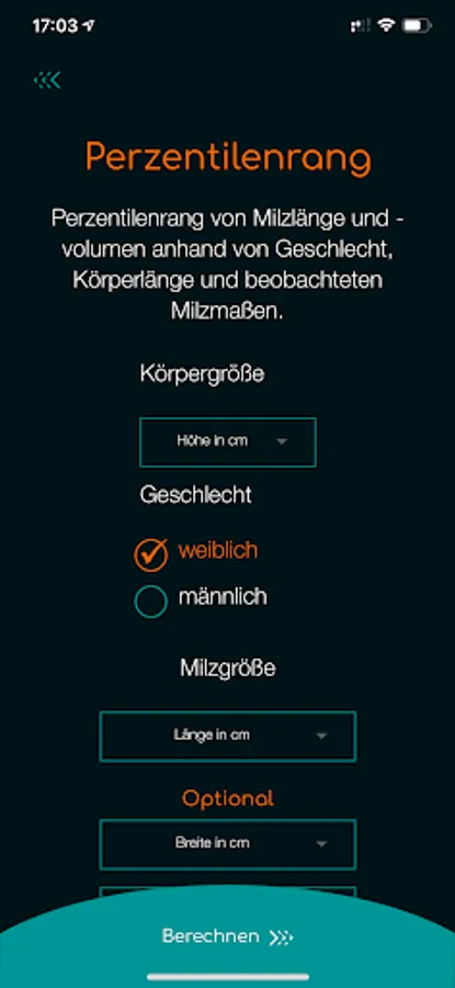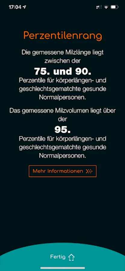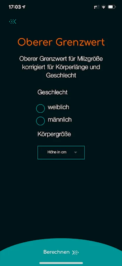 The size of the spleen is significantly influenced by body size and gender. The SplenoCalc app is used to calculate the probable percentile of the individual spleen size. The algorithm of the SplenoCalc app is based on height and gender, corrected for the normal homeostatic spleen lengths and volume (for women between 155 and 179 cm and for men between 165 and 199 cm height).