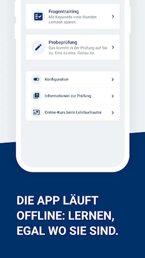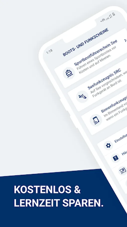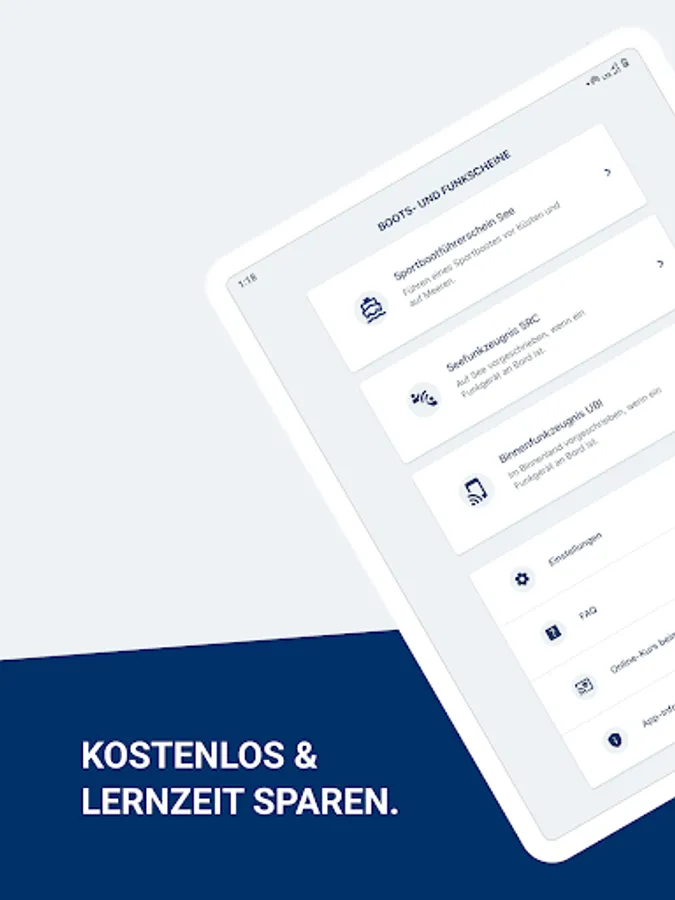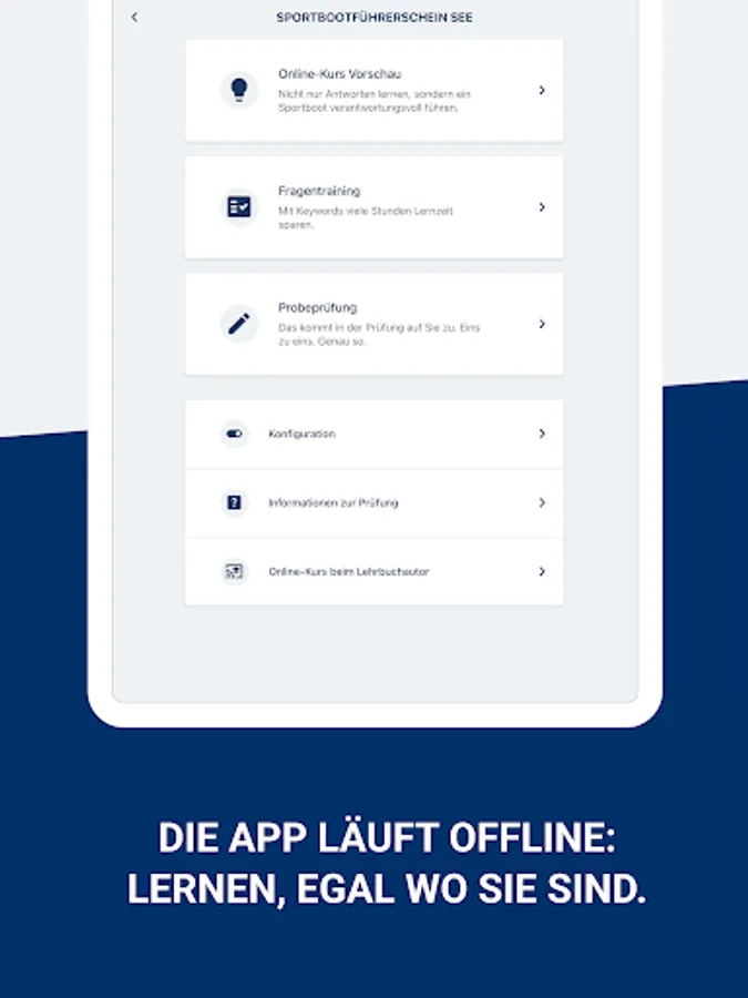 The app for the boat license / sports boat license (SBF), the radio certificates (sea radio certificate SRC and inland radio certificate UBI) and the pyro license (FKN).