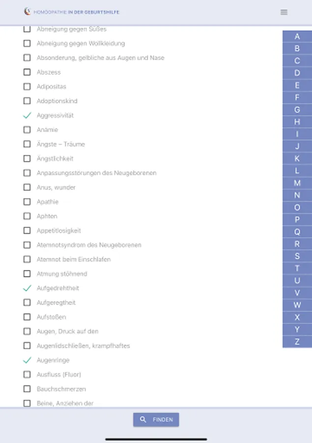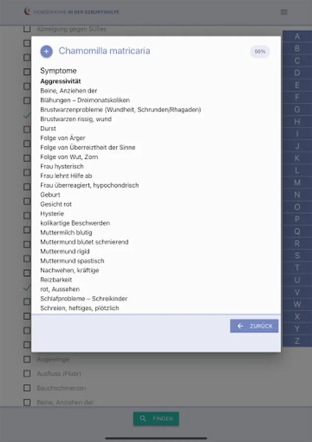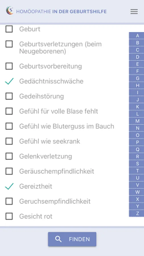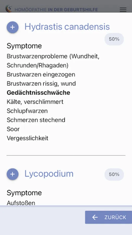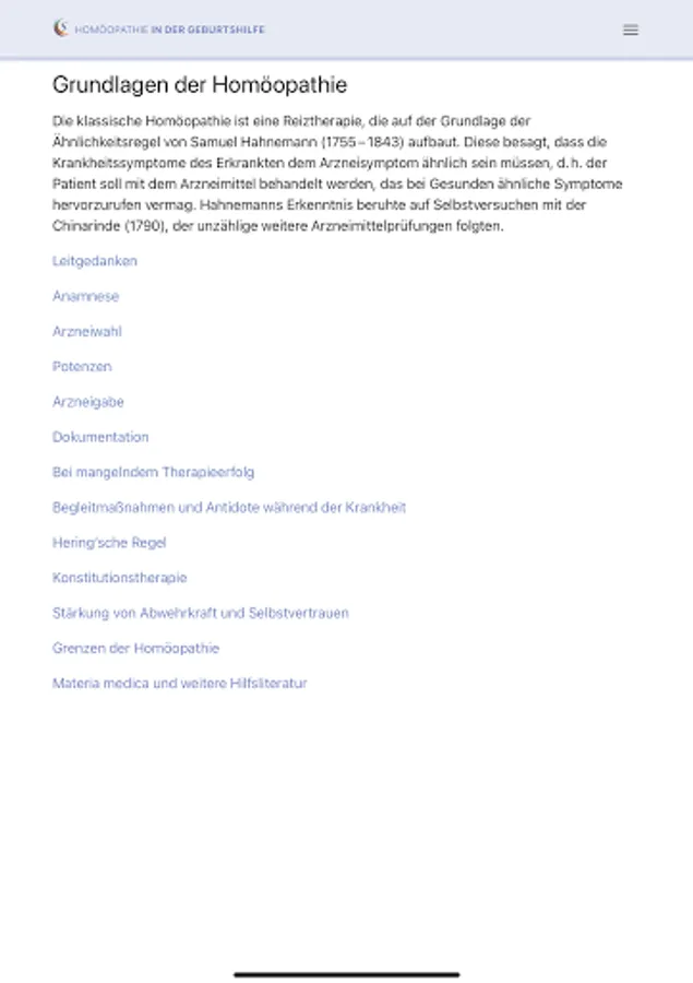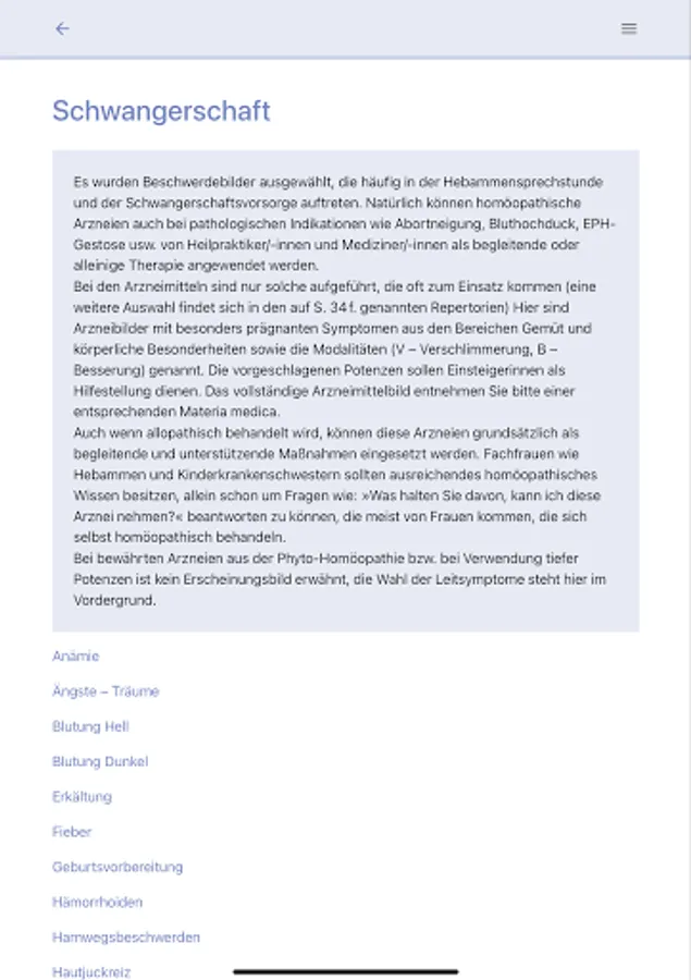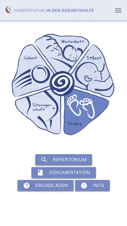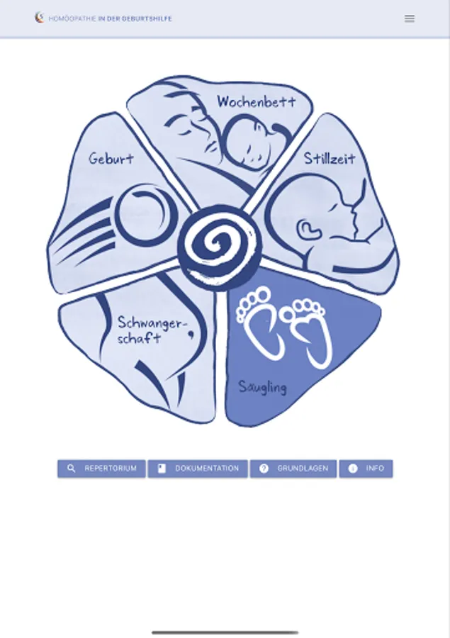 This advisor app helps midwives to find the right homeopathic remedy quickly and safely in everyday practice. The focus is on common and proven indications related to obstetrics. The selection is made via the main chapters pregnancy, childbirth, puerperium, breastfeeding and the infant. The short repertory provides a quick overview when finding remedies. However, it cannot replace looking up the drug picture for the corresponding indication, and it only refers to the drugs mentioned in the app. The choice of the simile is generally based on the art of repertorisation, i.e. the symptoms show the way to the simile. To find the right remedy, three to four of the symptoms of the disease must match the drug picture.