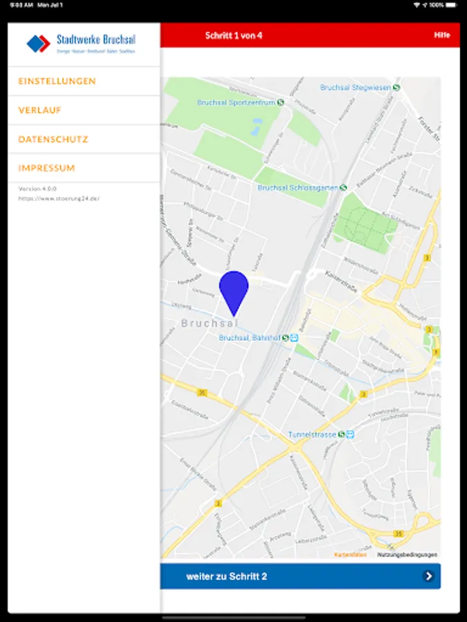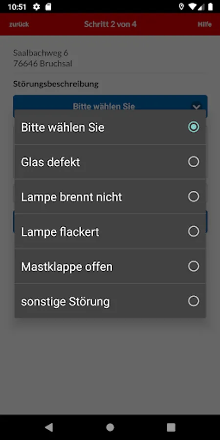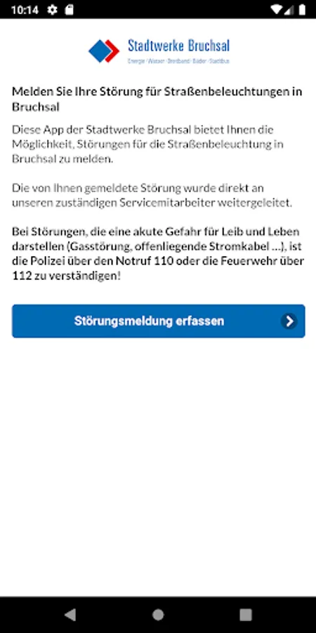 This app gives you the ability to easily and conveniently report disturbances for street lighting in the city of Bruchsal. The fault message will be forwarded directly to our service representative, who will fix the fault on the spot and eliminate the fault. In the case of faults that present an acute danger to life and limb (gas failure, exposed power cables, etc.), the police must be notified of the 112 emergency call or the fire service.