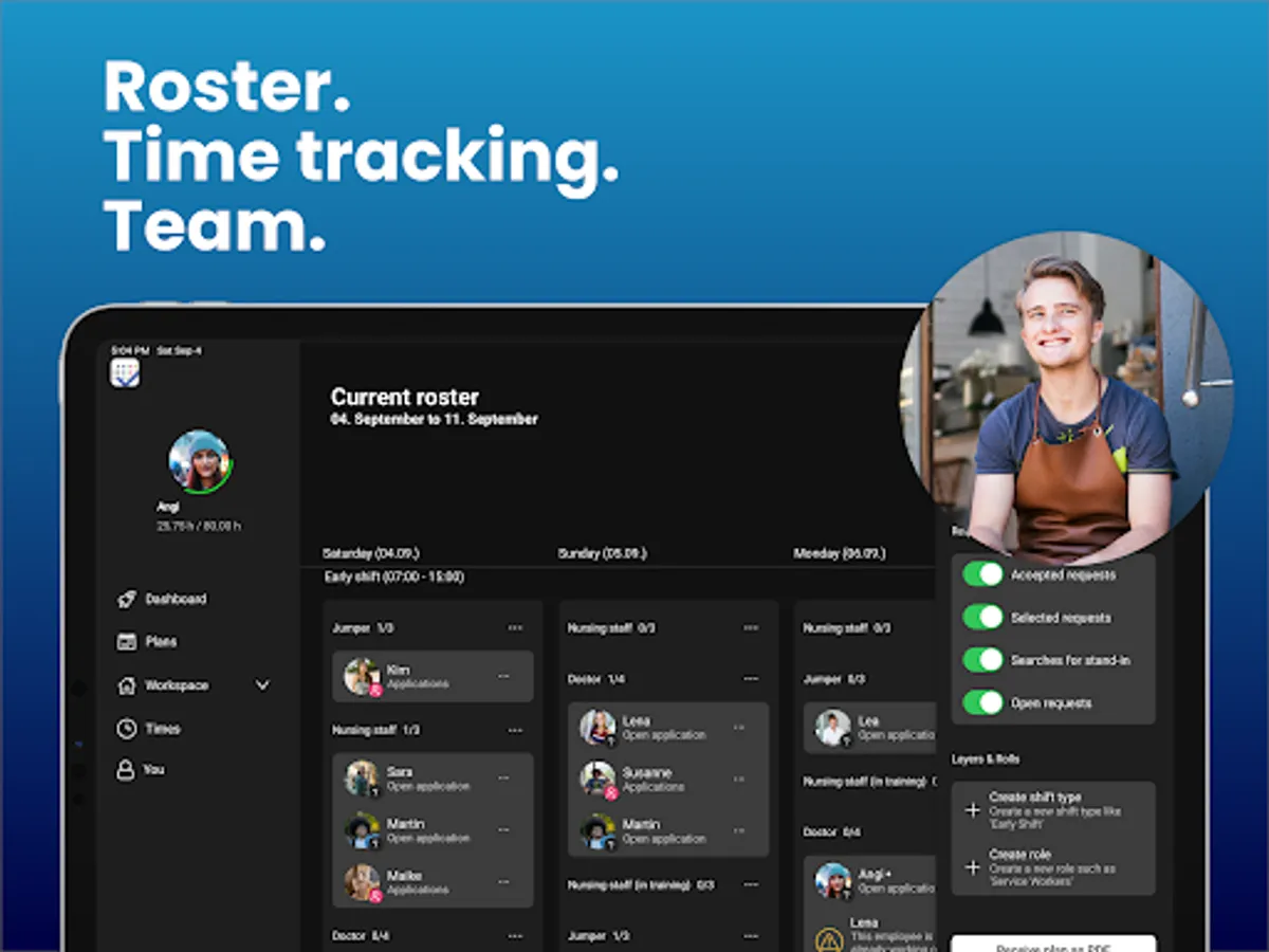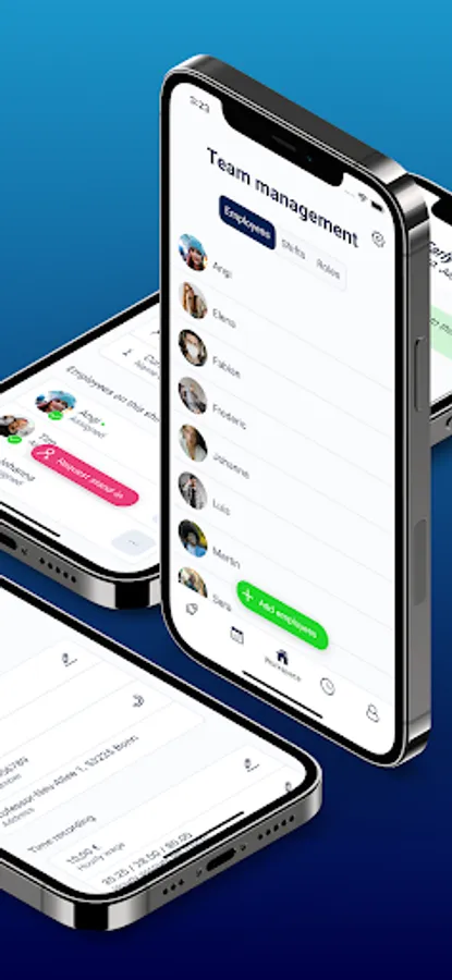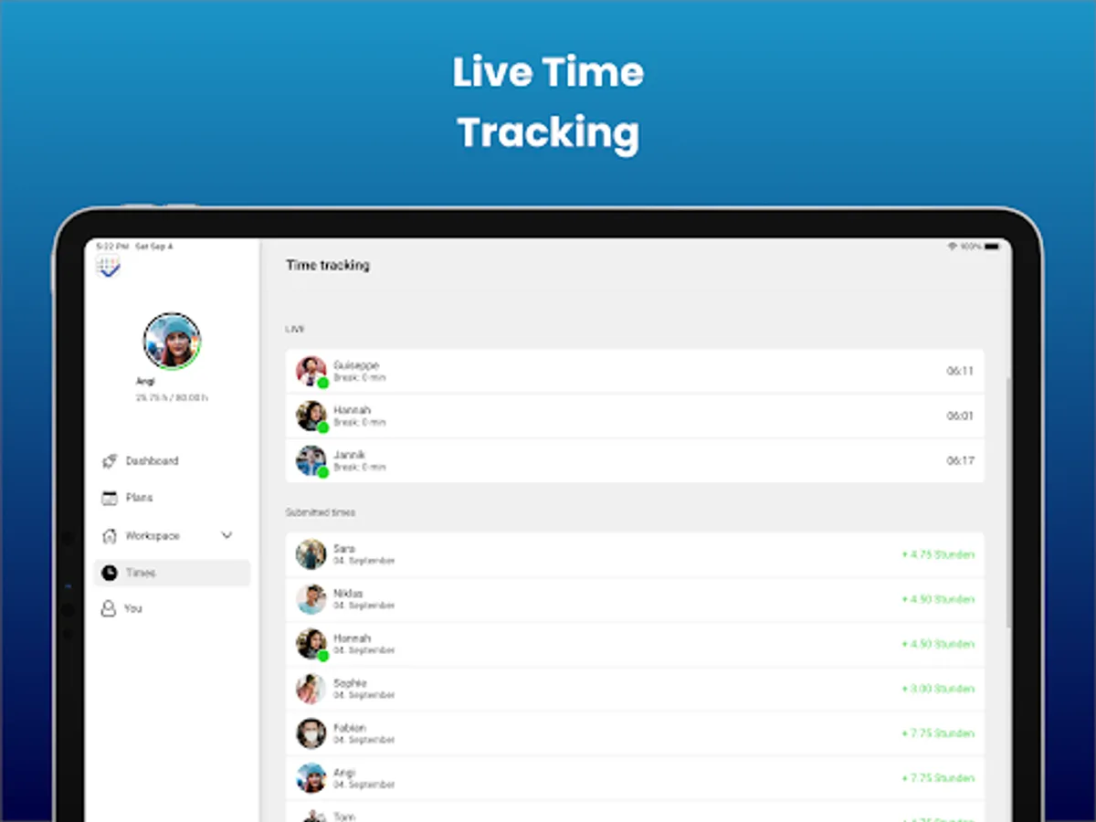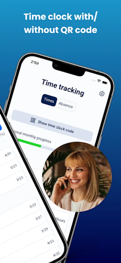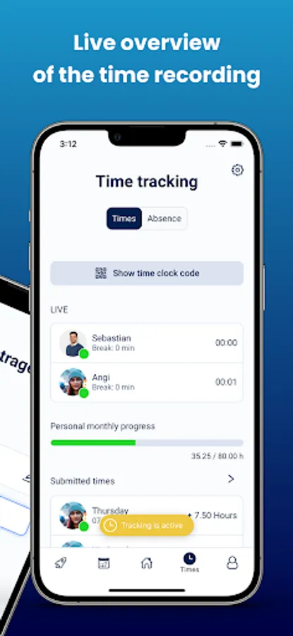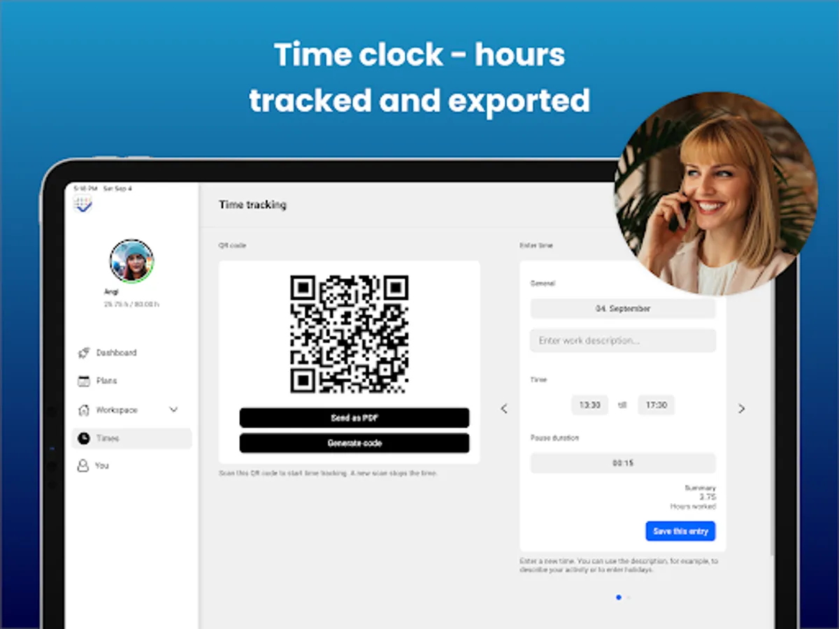 - Legally compliant time recording via (QR code) time clock or manual entry