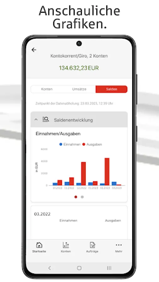 • Display as an overview and in detail of accounts, balances, income, expenses, turnover