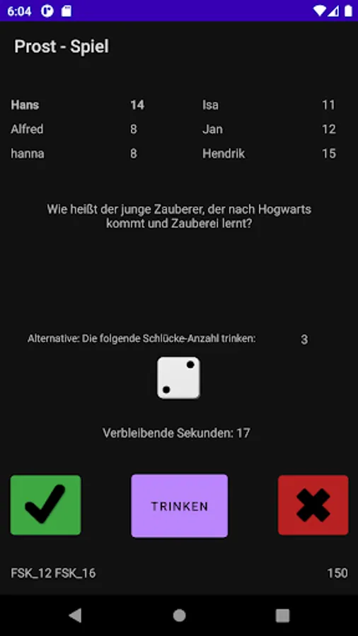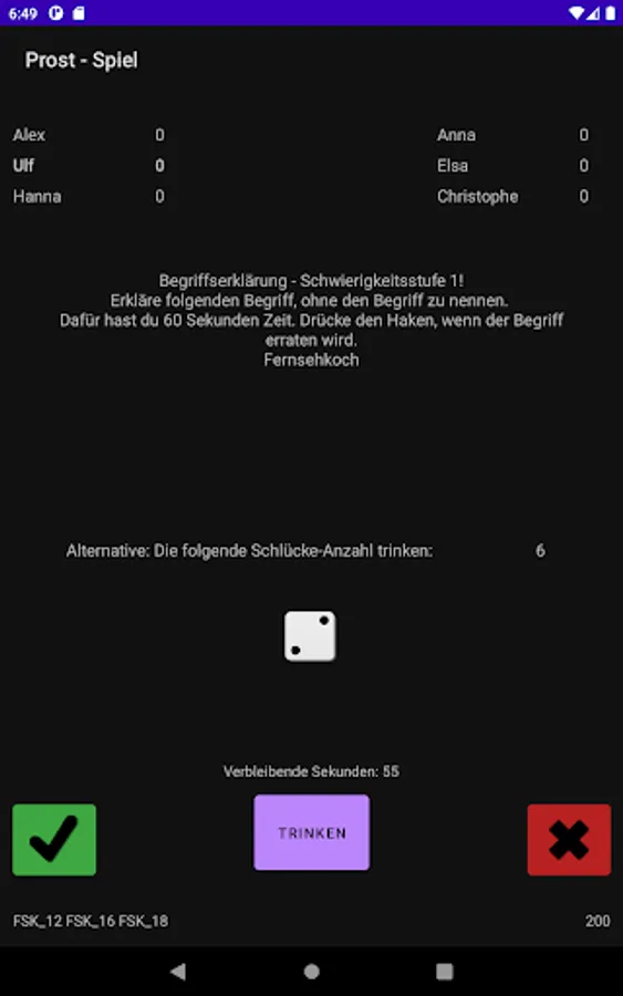 Each player is allowed to roll the dice during his turn and is then given a task that has to be solved. If he does not want to answer or the countdown is running, he must then drink a certain number of sips