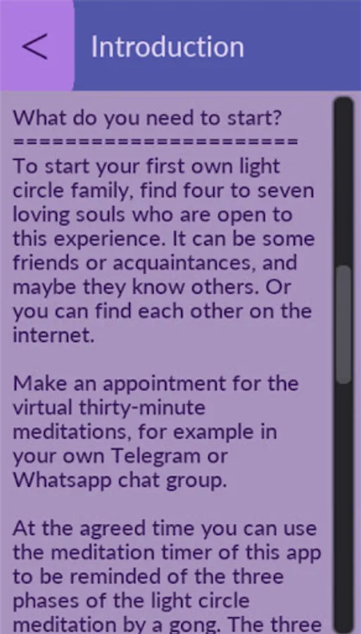Make an appointment for the virtual thirty-minute meditations, for example in your own Telegram or Whatsapp chat group. At the agreed time, you can use the meditation timer of this app to be reminded of the three phases of the light circle meditation by a gong. The three phases are described in detail in the instructions.